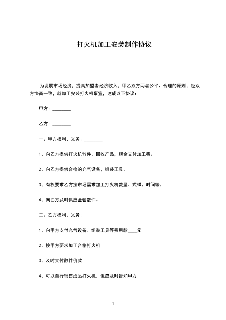 为发展市场经济,提高加盟者经济收入,甲乙双方两者公平、合理的原则,经双方协商一致,就加工安装打火机事宜,达成以下协议: