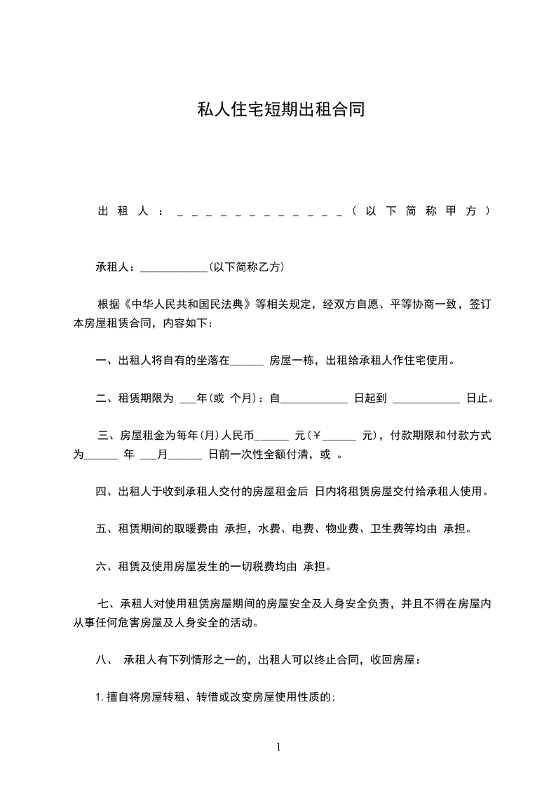 8、因不可抗力原因导致该房屋毁损和造成损失的,双方互不承担责任。