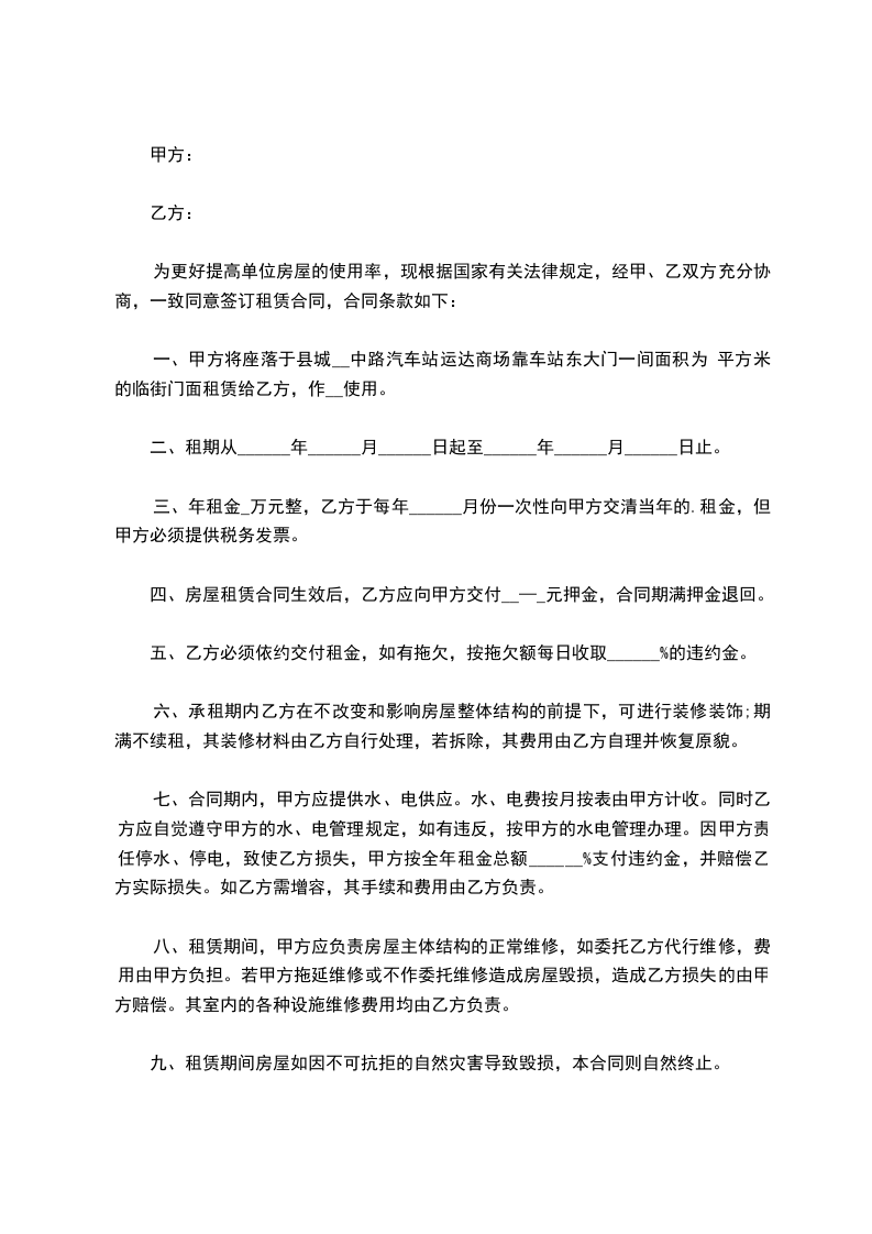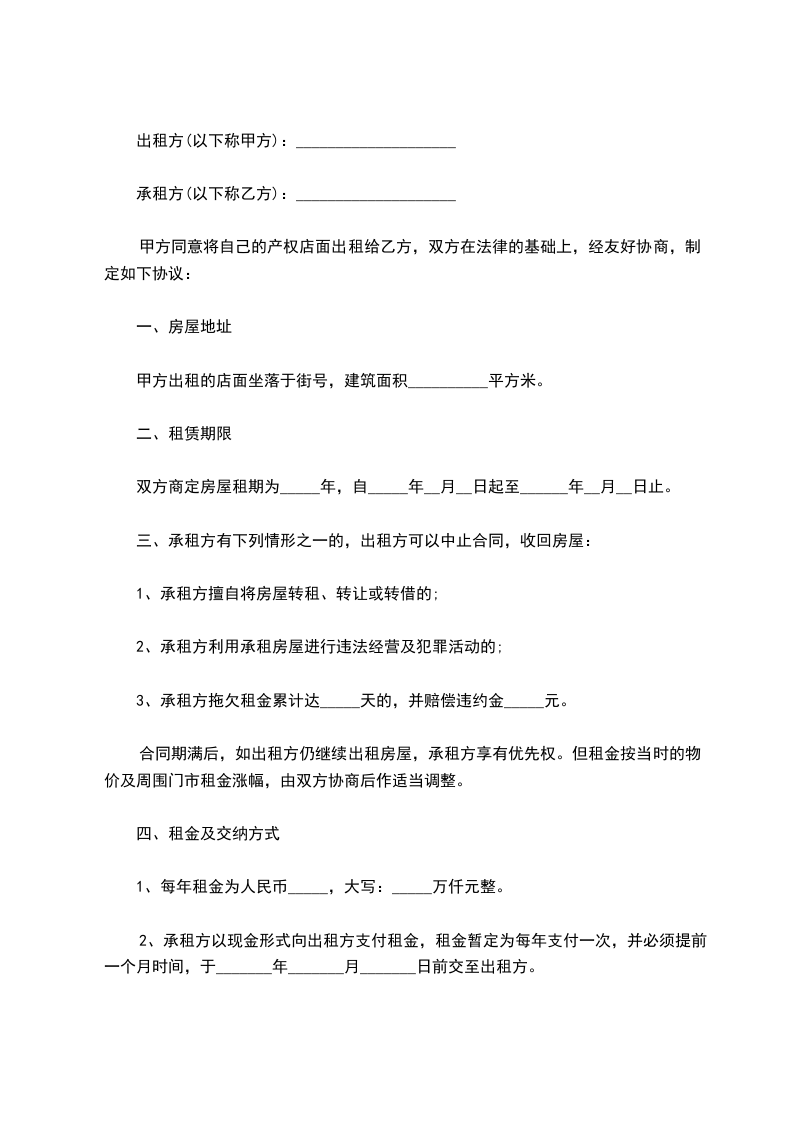 甲方同意将自己的房屋商铺出租给乙方,双方在法律的基础上,经友好协商,制定如下协议: