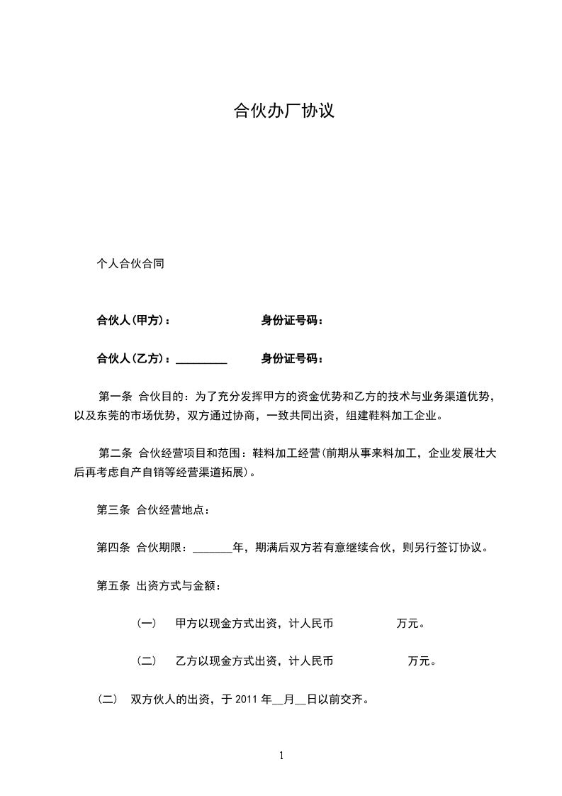 第一条 合伙目的:为了充分发挥甲方的资金优势和乙方的技术与业务渠道优势,以及东莞的市场优势,双方通过协商,一致共同出资,组建鞋料加工企业。