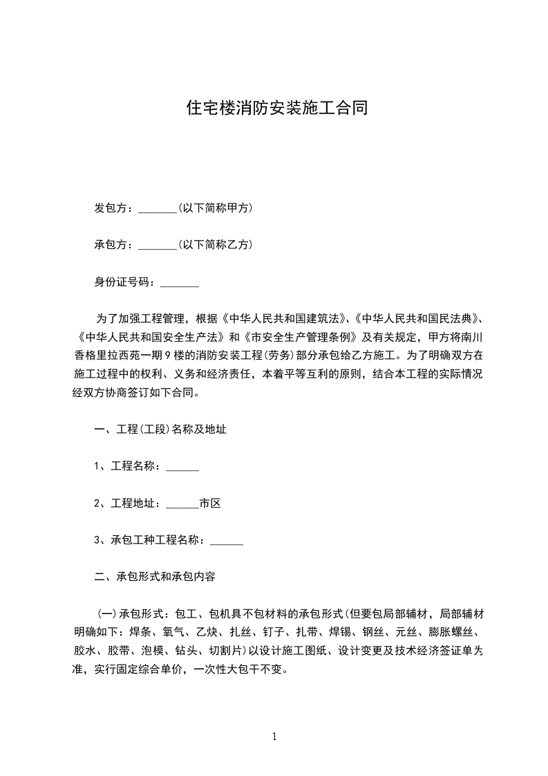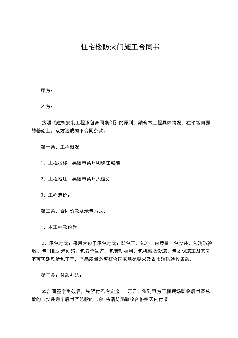 2、承包方式:采用大包干承包方式:即包工、包料、包质量、包安装、包消防验收、包门框边灌砂浆、包安全生产、包劳动福利、包机械及设施、包文明施工及其它不可预测风险包干等,产品质量必须符合国家规范要求及省市消防验收条款。