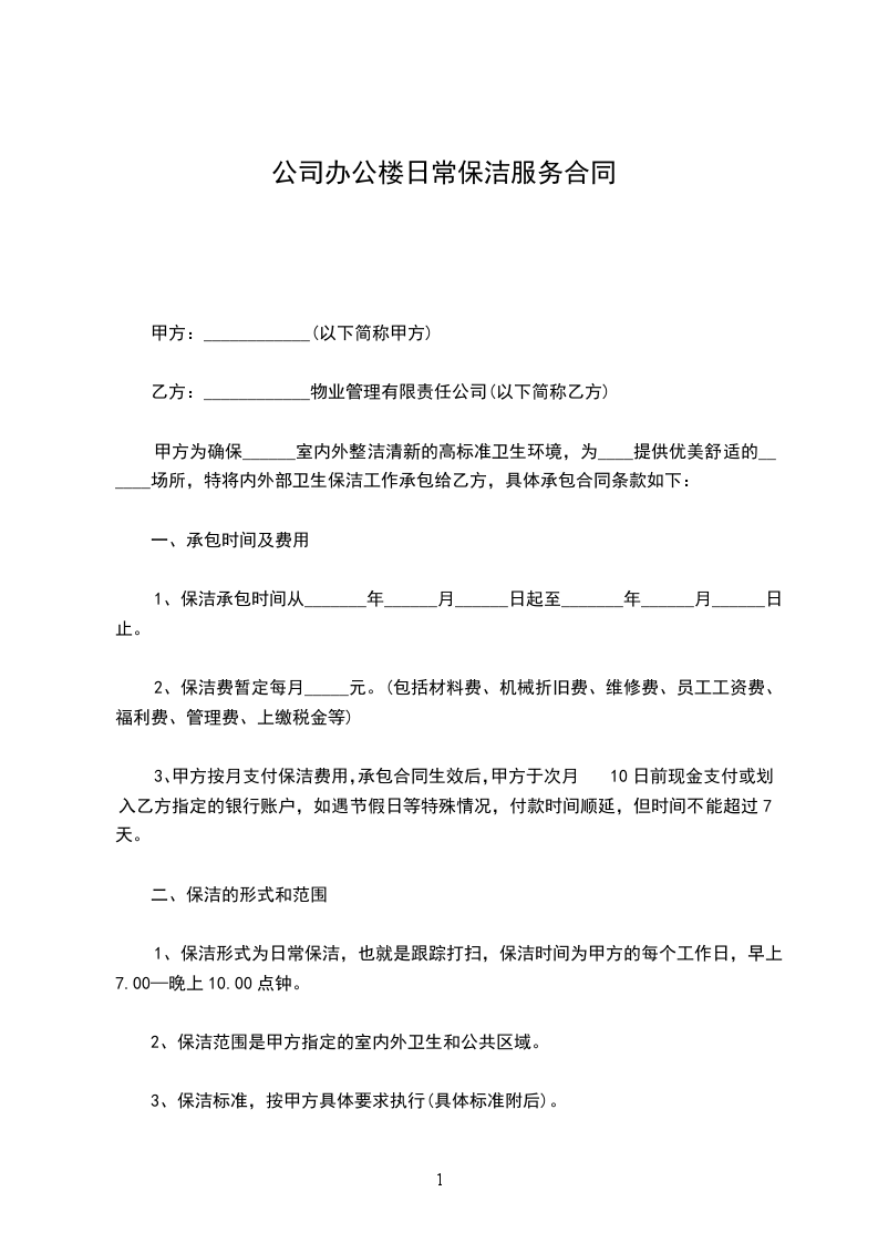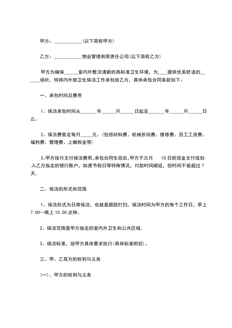 3、本合同依法签订,具有法律约束力,双方共同履行,如需用改变,双方协商解决,不得擅自变更或解除,否则如一方违约,需向另一方赔偿全年保洁费的20%。