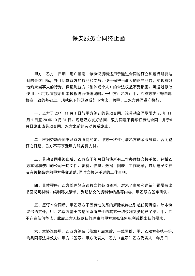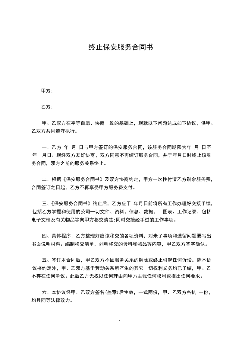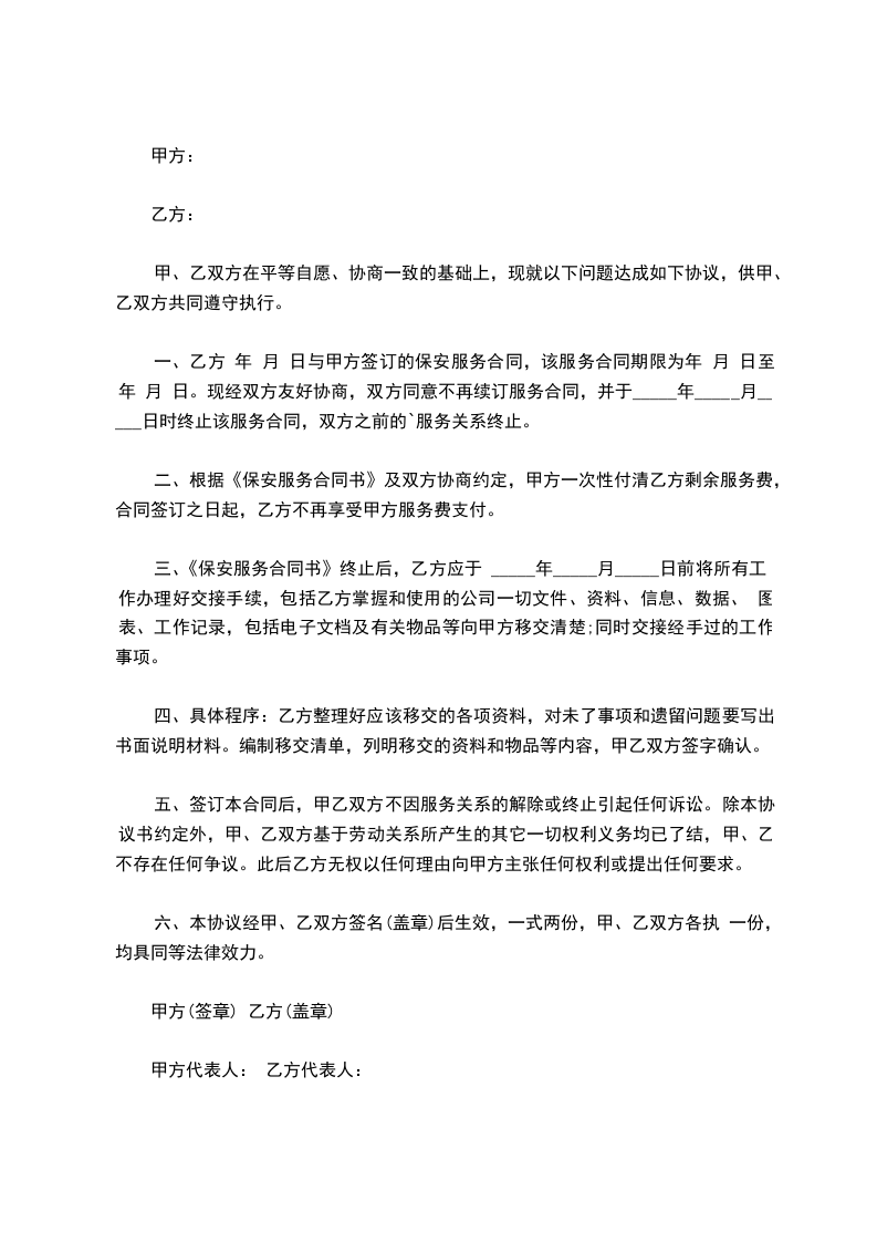 一、乙方 年 月 日与甲方签订的保安服务合同,该服务合同期限为年 月 日至 年 月日。现经双方友好协商,双方同意不再续订服务合同,并于_____年_____月_____日时终止该服务合同,双方之前的服务关系终止。