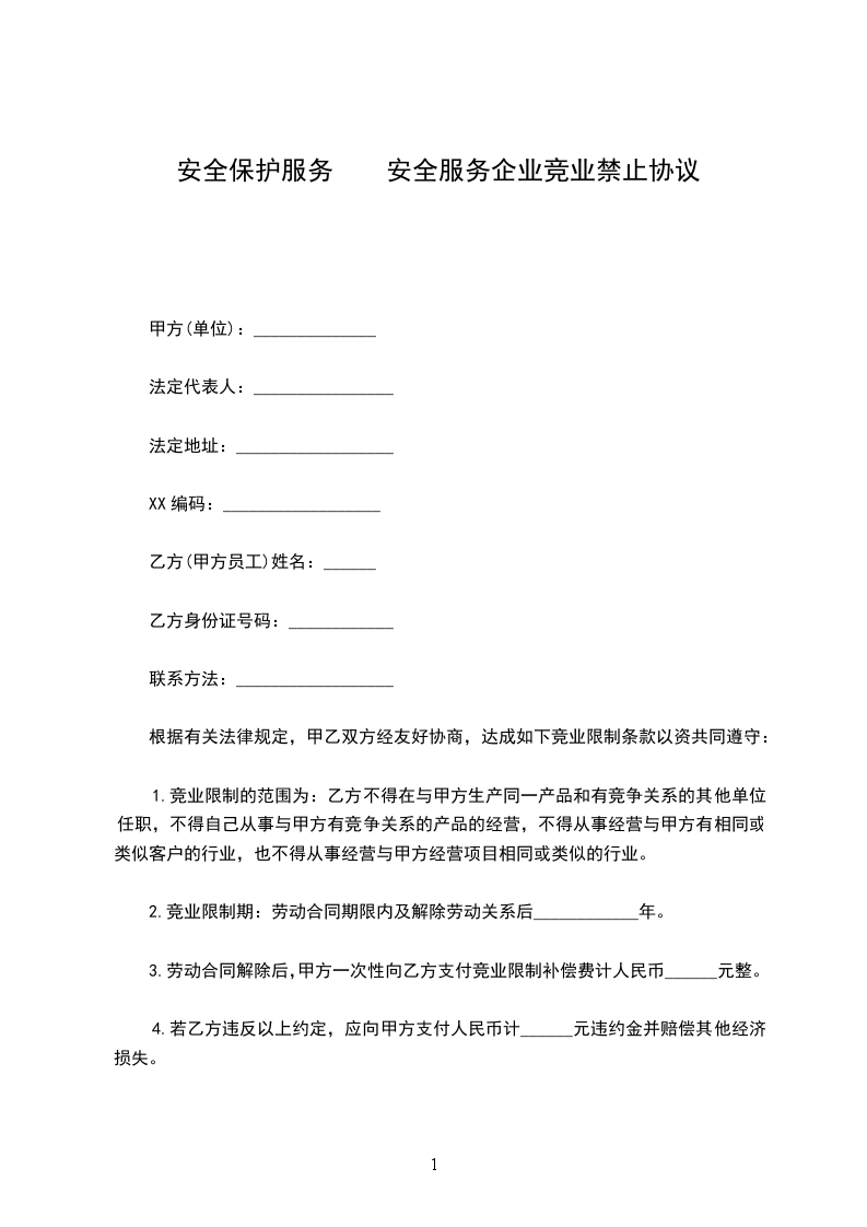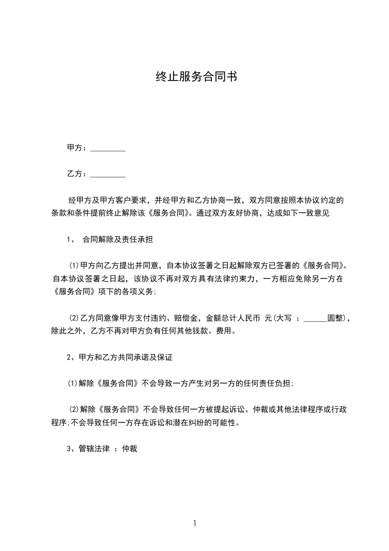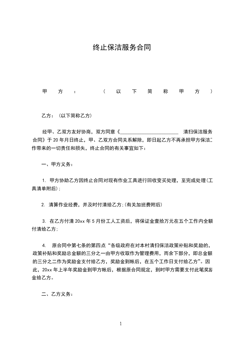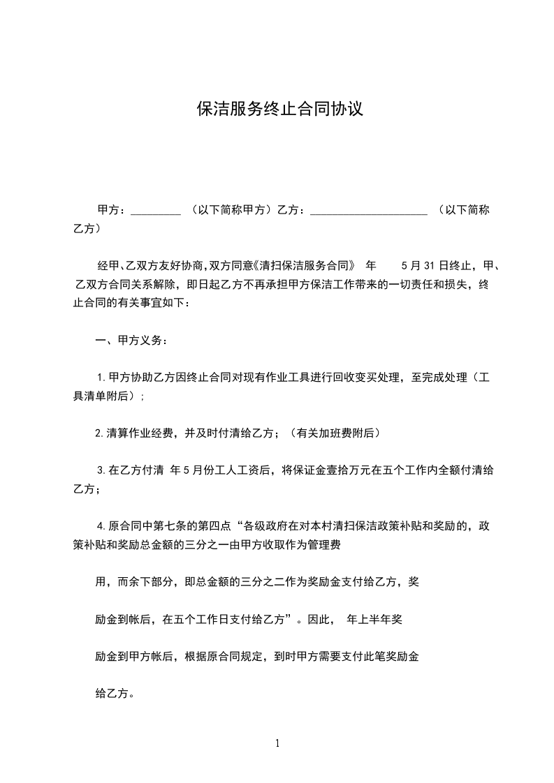 一、乙方 年 月 日与甲方签订的保安服务合同,该服务合同期限为年 月 日至 年 月日。现经双方友好协商,双方同意不再续订服务合同,并于_____年_____月_____日时终止该服务合同,双方之前的服务关系终止。