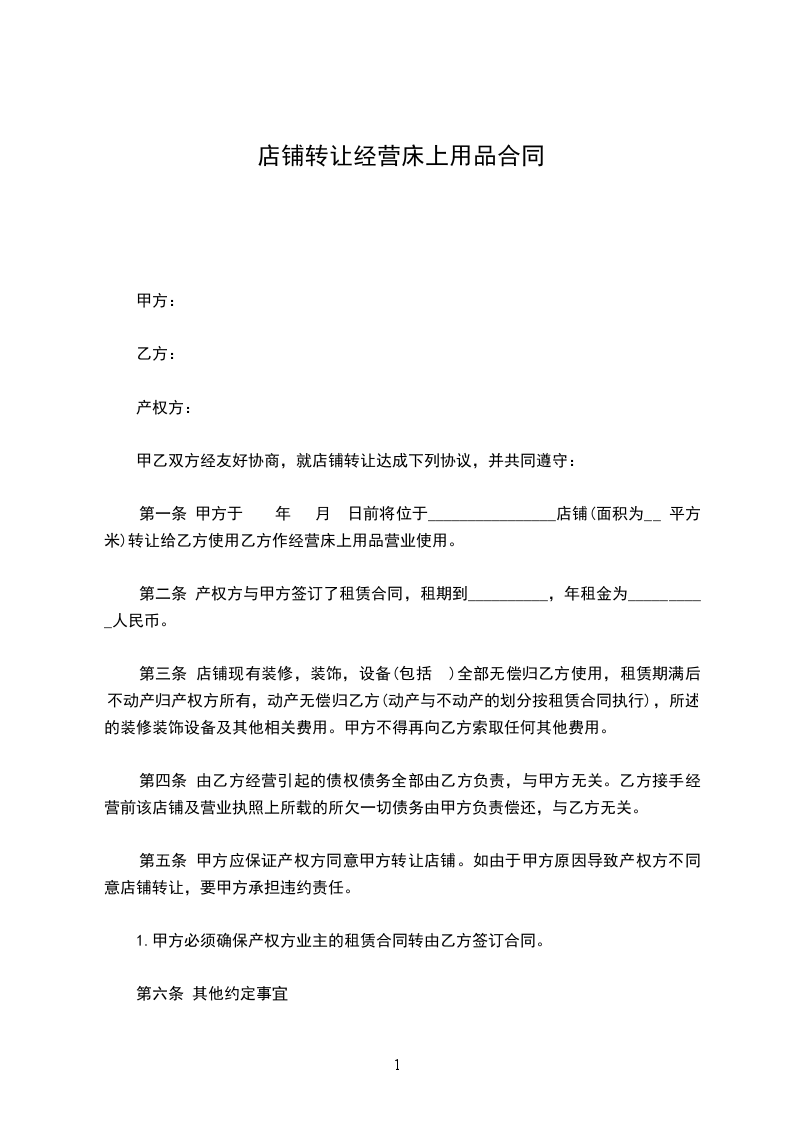 第一条 甲方于 年 月 日前将位于________________店铺(面积为__ 平方米)转让给乙方使用乙方作经营床上用品营业使用。