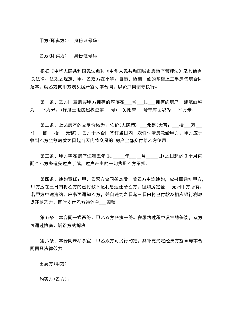 第三条、甲方需在房产证满五年(即_____年_____月_____日)之日起的3个月内配合乙方办理完过户手续,过户产生的一切费用乙方承担。