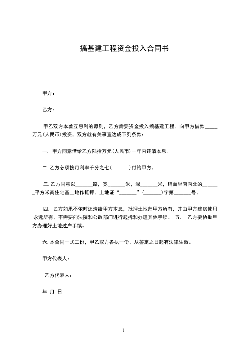甲乙双方本着互惠利的原则,乙方需要资金投入搞基建工程。向甲方借款 万元(人民币)投资,双方就有关事宜达成下列条款: