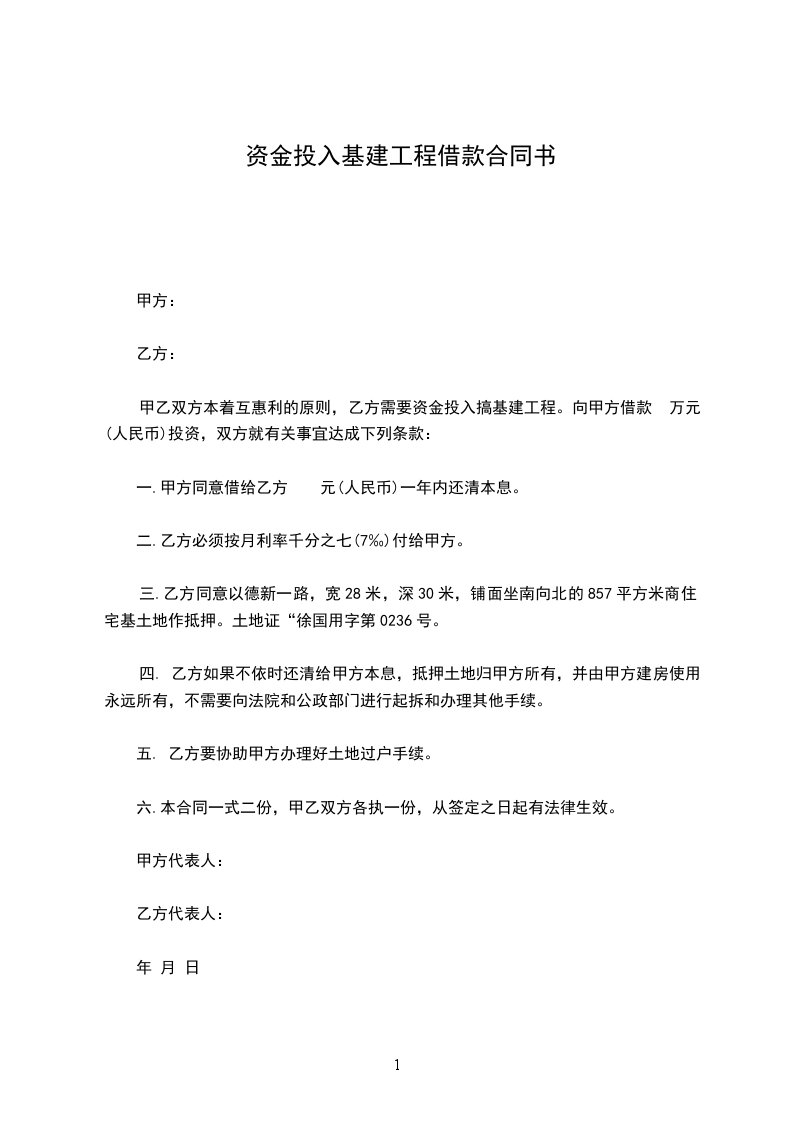三.乙方同意以德新一路,宽28米,深30米,铺面坐南向北的857平方米商住宅基土地作抵押。土地证“徐国用字第0236号。