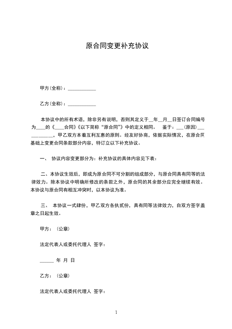 本协议中的所有术语,除非另有说明,否则其定义于__年__月__日签订合同编号为____的《____合同》《以下简称“原合同”》中的定义相同。 鉴于:___(原因)____________,甲乙双方本着互利互惠的原则。经友好协商,依据实际情况,在原合同基础上变更合同条款部分内容,特订立以下补充协议。