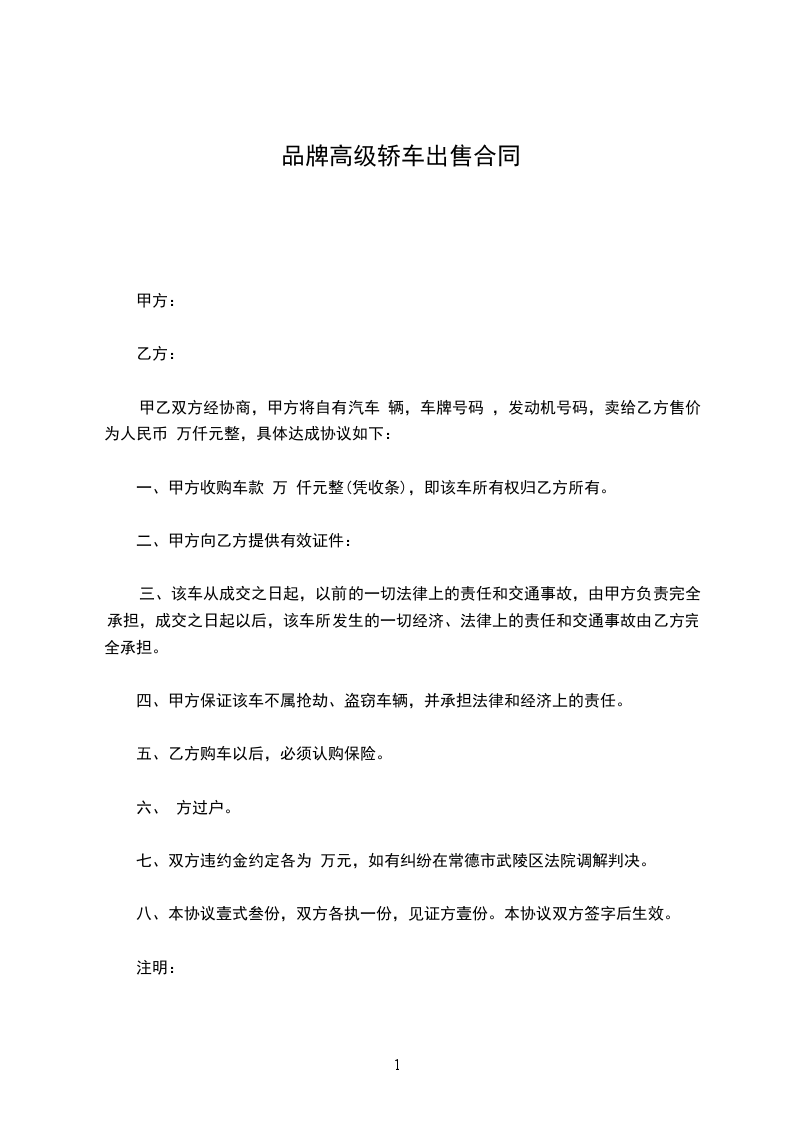甲乙双方经协商,甲方将自有汽车 辆,车牌号码 ,发动机号码,卖给乙方售价为人民币 万仟元整,具体达成协议如下: