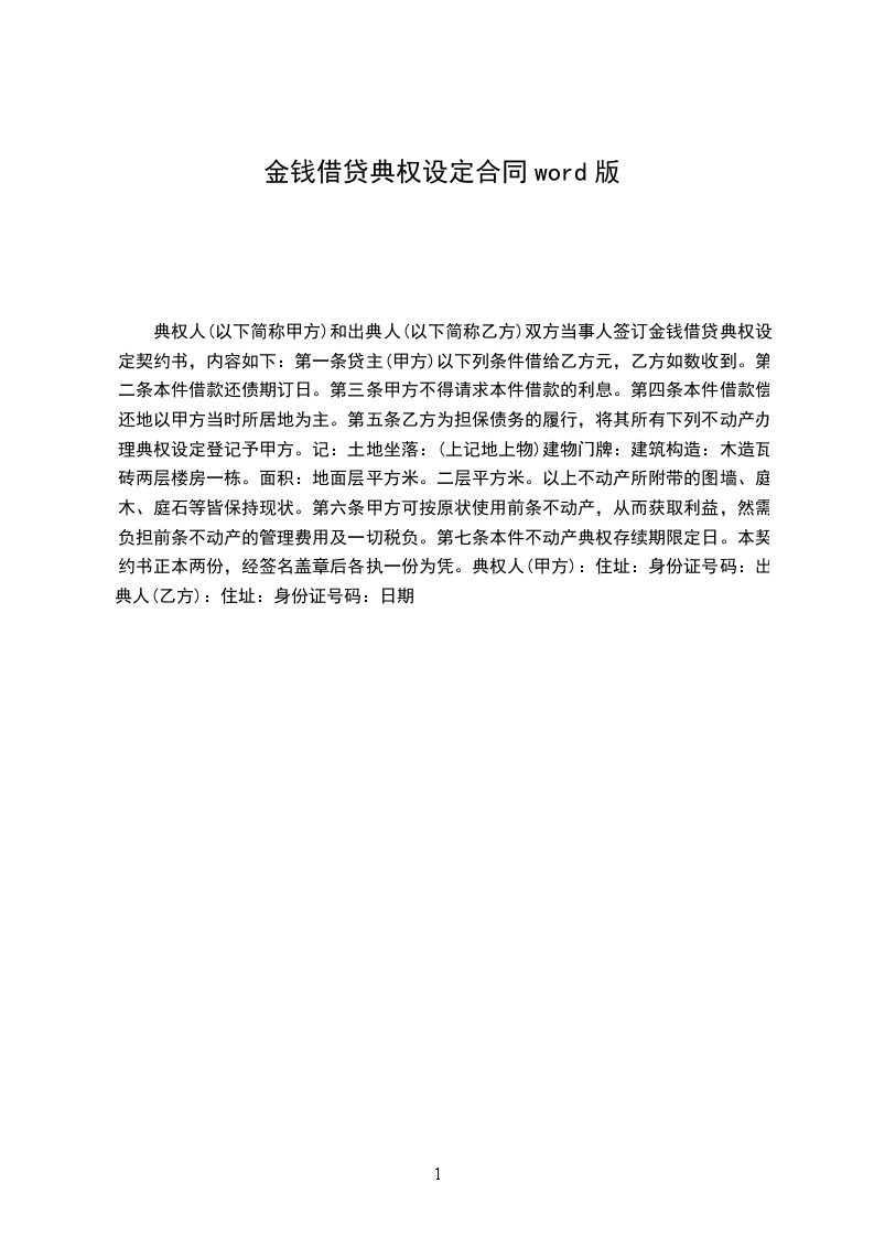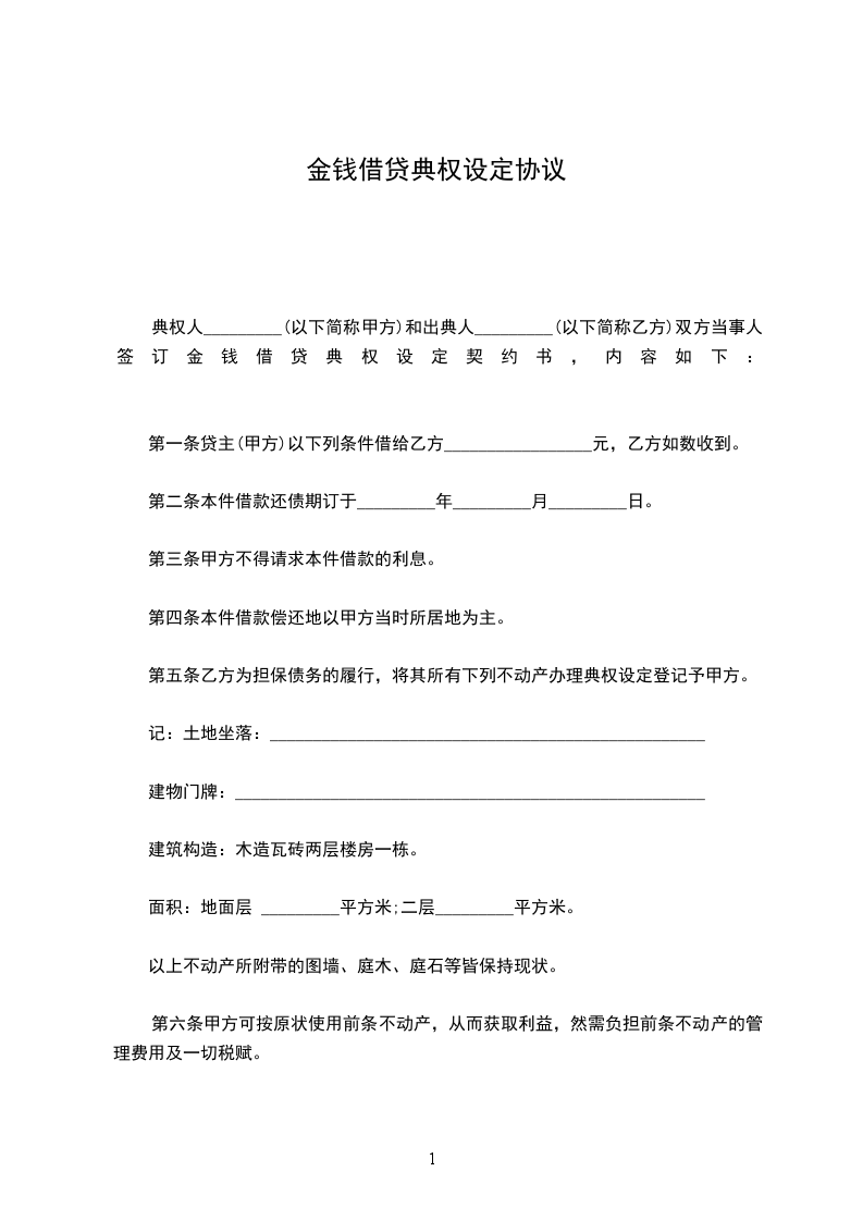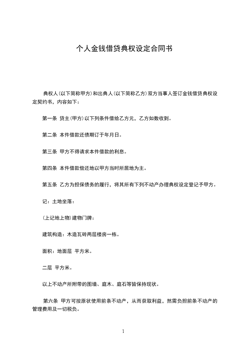 典权人(以下简称甲方)和出典人(以下简称乙方)双方当事人签订金钱借贷典权设定契约书,内容如下: