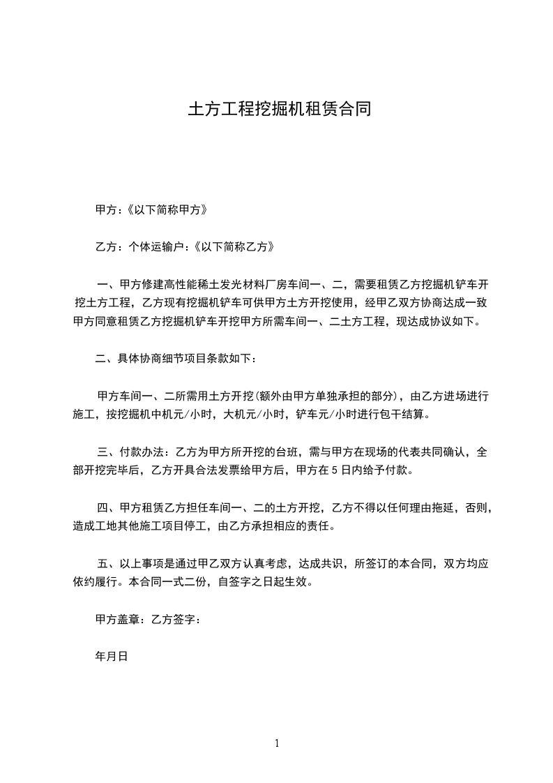 一、甲方修建高性能稀土发光材料厂房车间一、二,需要租赁乙方挖掘机铲车开挖土方工程,乙方现有挖掘机铲车可供甲方土方开挖使用,经甲乙双方协商达成一致,甲方同意租赁乙方挖掘机铲车开挖甲方所需车间一、二土方工程,现达成协议如下。