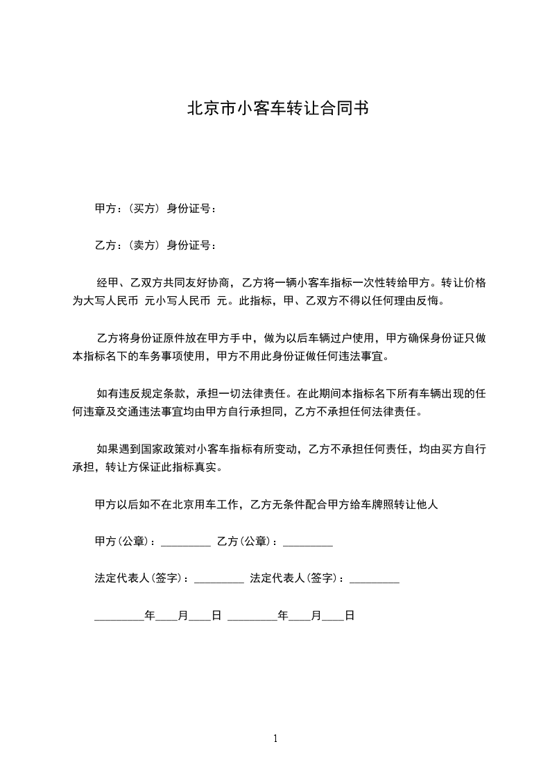 经甲、乙双方共同友好协商,乙方将一辆小客车指标一次性转给甲方。转让价格为大写人民币 元小写人民币 元。此指标,甲、乙双方不得以任何理由反悔。