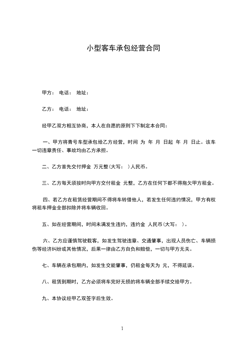 一、甲方将青号车型承包给乙方经营,时间 为 年 月 日起 年 月 日止。该车一切违章责任、事故均由乙方承担。