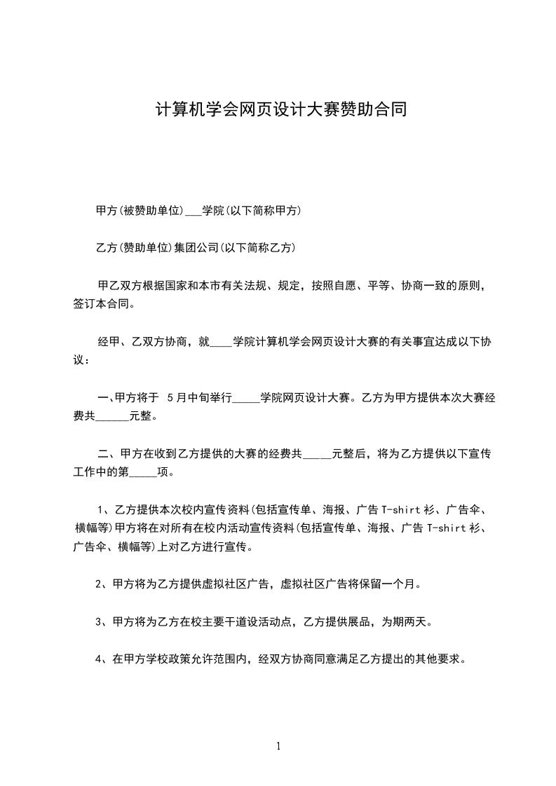 一、甲方将于5月中旬举行_____学院网页设计大赛。乙方为甲方提供本次大赛经费共______元整。