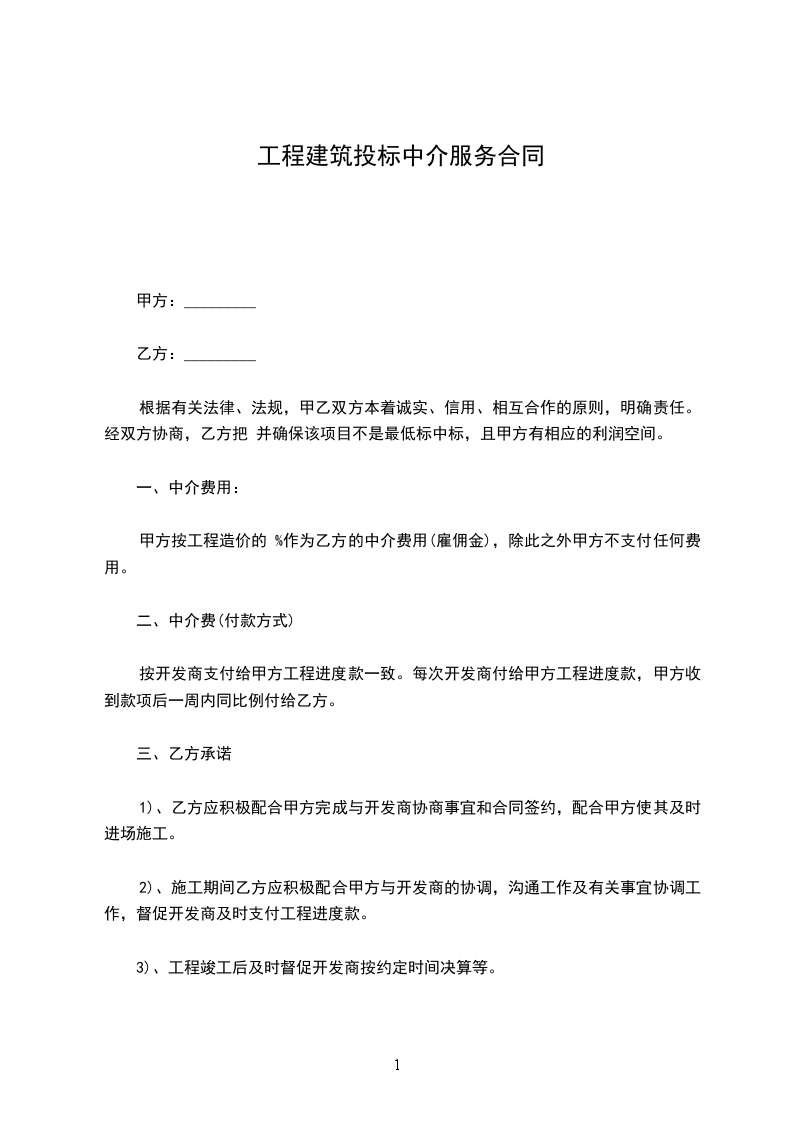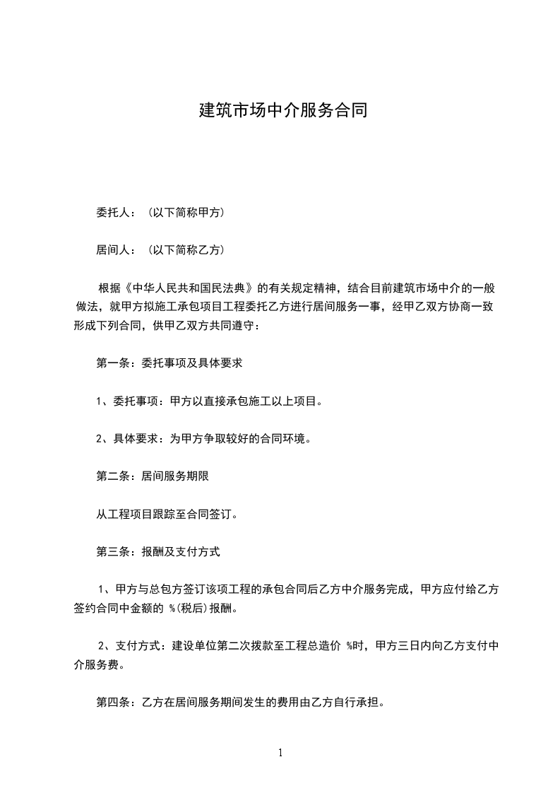 根据《中华人民共和国民法典》的有关规定精神,结合目前建筑市场中介的一般做法,就甲方拟施工承包项目工程委托乙方进行居间服务一事,经甲乙双方协商一致,形成下列合同,供甲乙双方共同遵守: