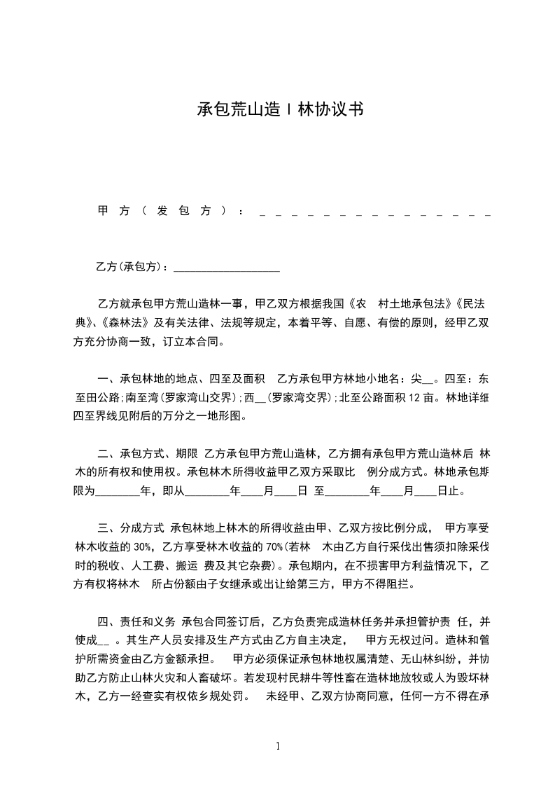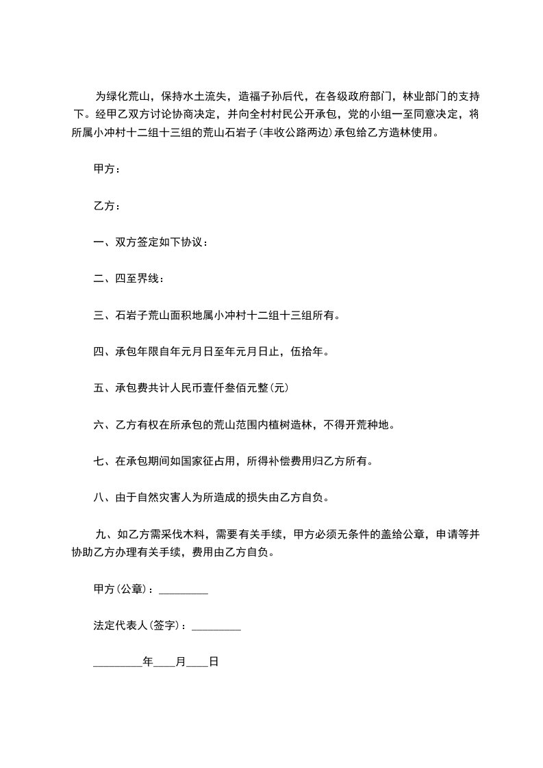 为绿化荒山,保持水土流失,造福子孙后代,在各级政府部门,林业部门的支持下。经甲乙双方讨论协商决定,并向全村村民公开承包,党的小组一至同意决定,将所属小冲村十二组十三组的荒山石岩子(丰收公路两边)承包给乙方造林使用。