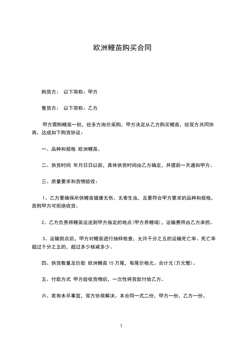 甲方需购鳗苗一批,经多方询价采购,甲方决定从乙方购买鳗苗,经双方共同协商,达成如下购货协议: