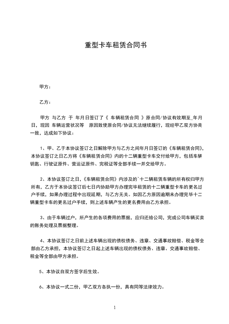 1、甲、乙于本协议签订之日解除甲方与乙方之间_____年_____月_____日签订的《车辆租赁合同》,本协议签订之日乙方将《车辆租赁合同》内的十二辆重型卡车交付给甲方,包括车辆钥匙、行驶证原件、营运证原件、完税证等全部手续一并交给甲方。
