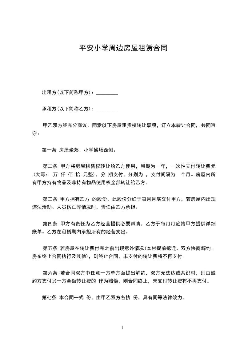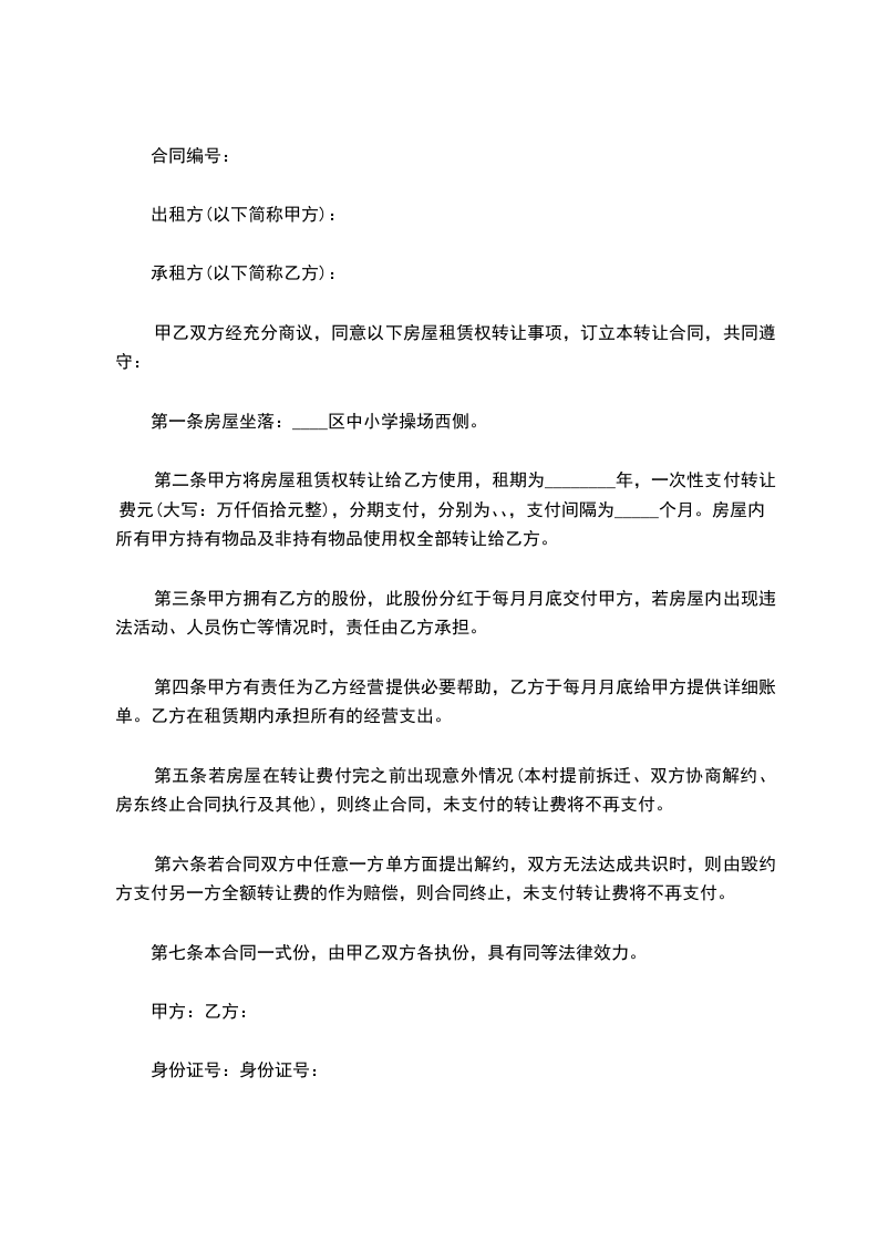 第二条甲方将房屋租赁权转让给乙方使用,租期为________年,一次性支付转让费元(大写:万仟佰拾元整),分期支付,分别为、、,支付间隔为_____个月。房屋内所有甲方持有物品及非持有物品使用权全部转让给乙方。