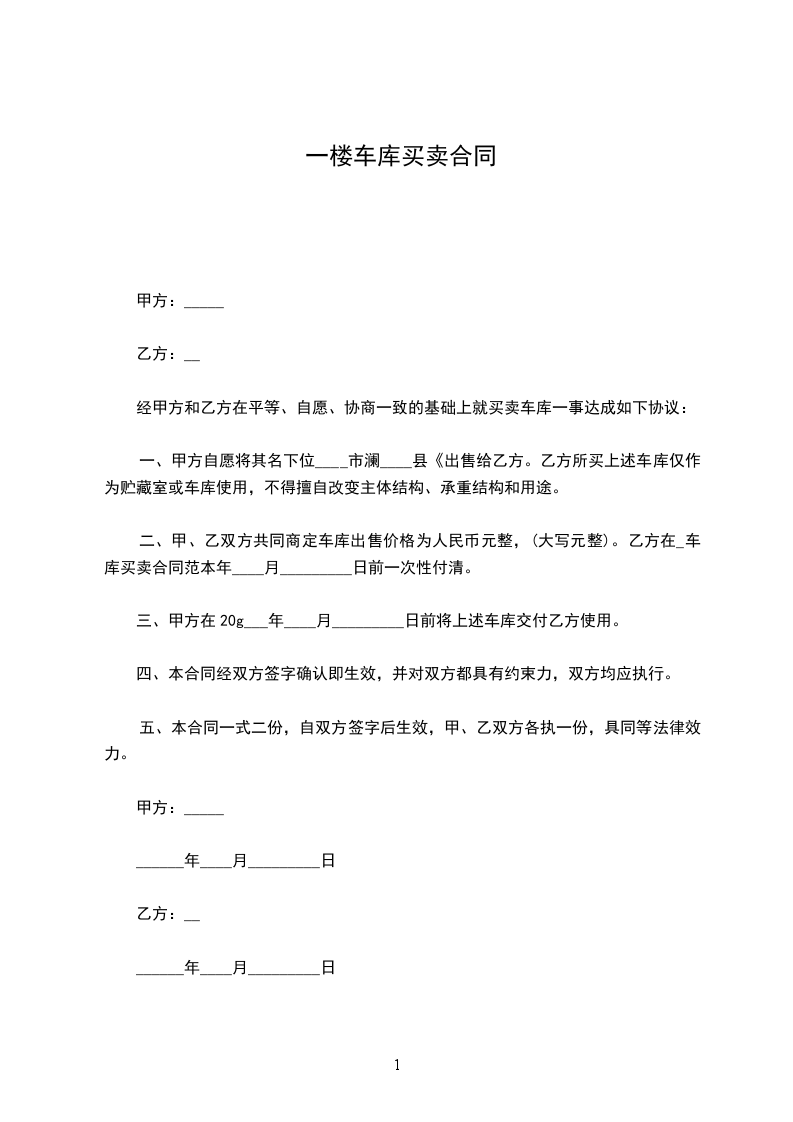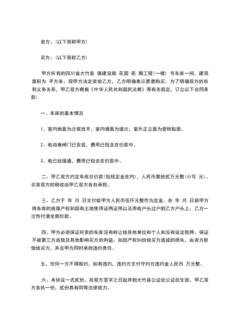 甲方所有的四川省大竹县 镇建设路 花园 苑 期工程(一楼) 号车库一间,建筑面积为 平方米。现甲方决定卖给乙方,乙方明确表示愿意购买。为了明确双方的权利义务关系,甲乙双方根据《中华人民共和国民法典》等有关规定,订立以下合同条款: