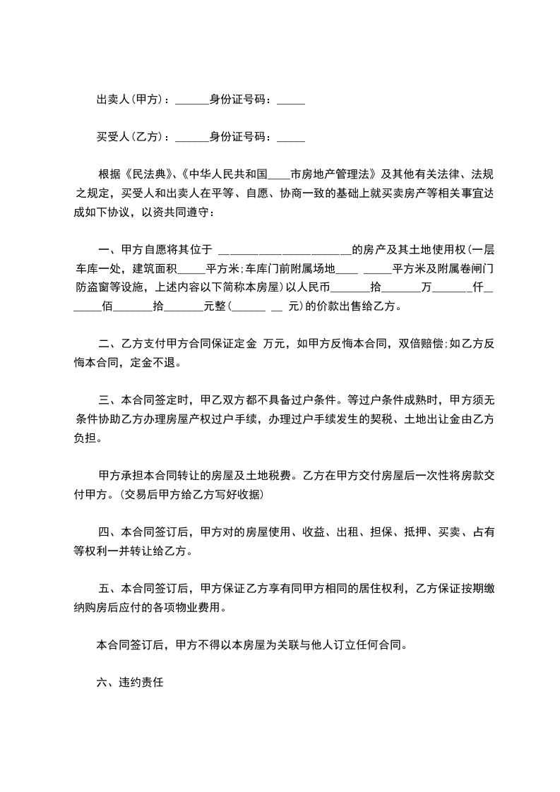 三、乙方于 年 月 日支付给甲方人民币伍仟元整作为定金。在 年 月 日前甲方将车库的房屋产权和国有土地使用证两证用以及用电户头过户到乙方户头上。乙方一次性付清全部价款。