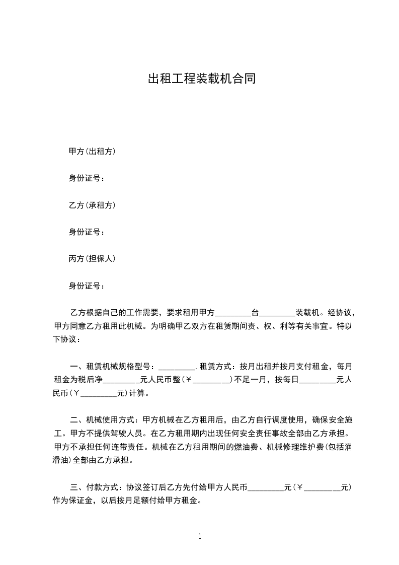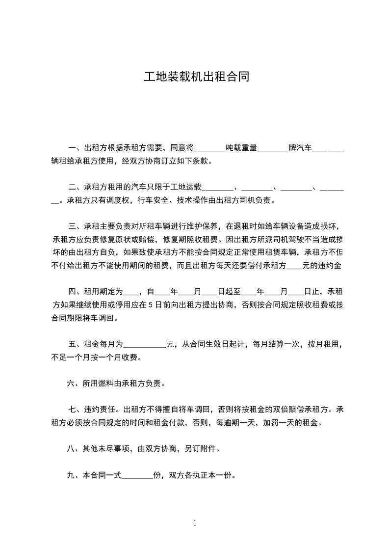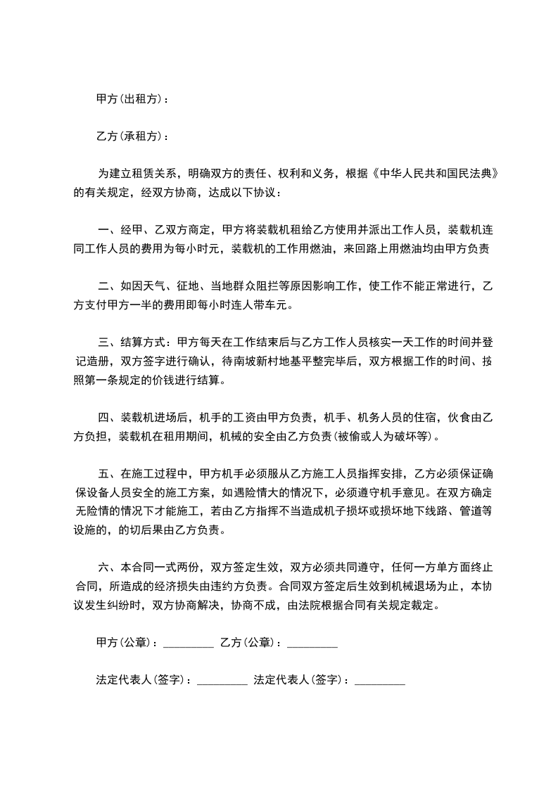 一、经甲、乙双方商定,甲方将装载机租给乙方使用并派出工作人员,装载机连同工作人员的费用为每小时元,装载机的工作用燃油,来回路上用燃油均由甲方负责。