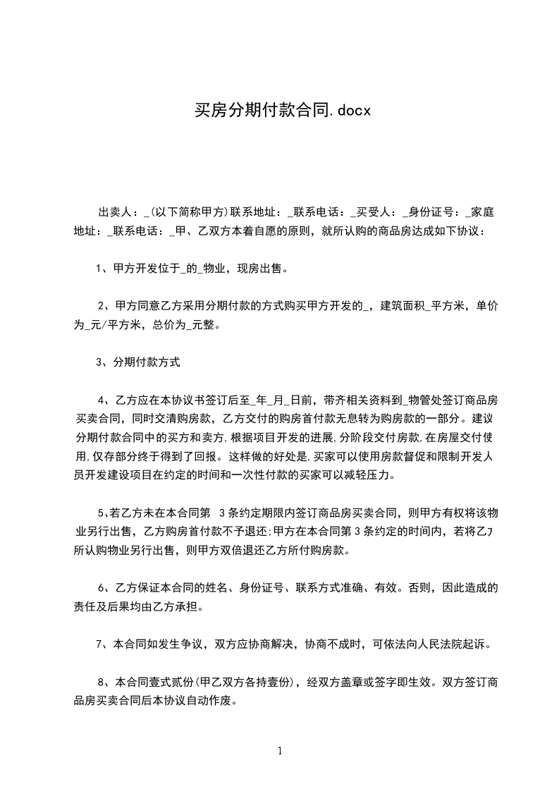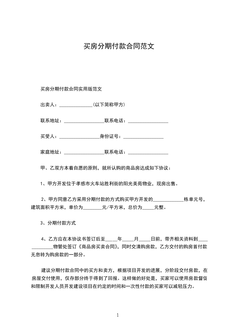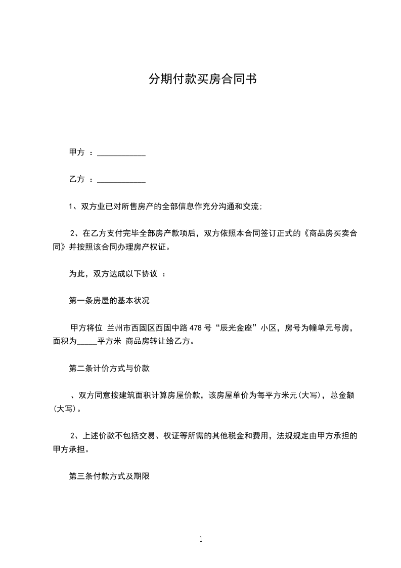 2、甲方同意乙方采用分期付款的方式购买甲方开发的栋单元号,建筑面积为________平方米,单价为________元/平方米,总价为________元整。