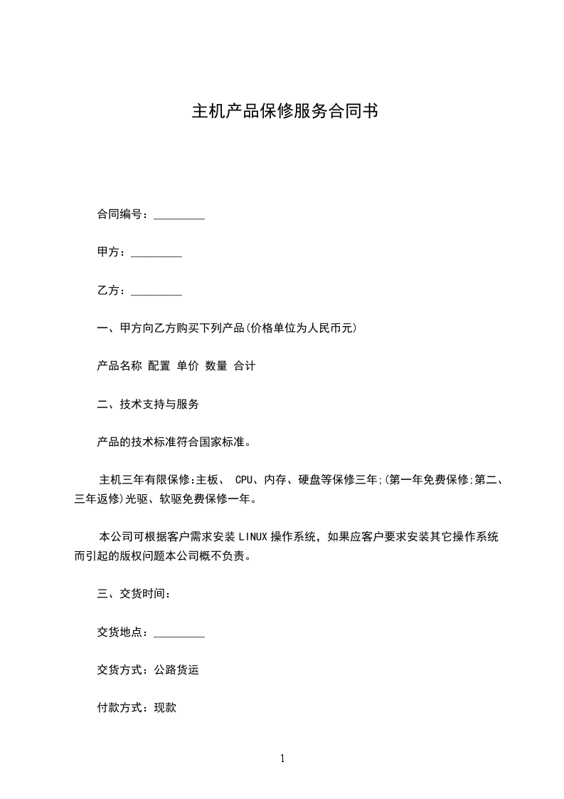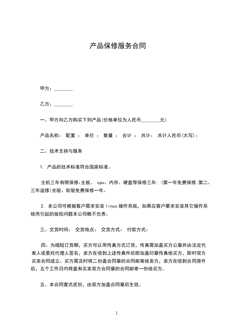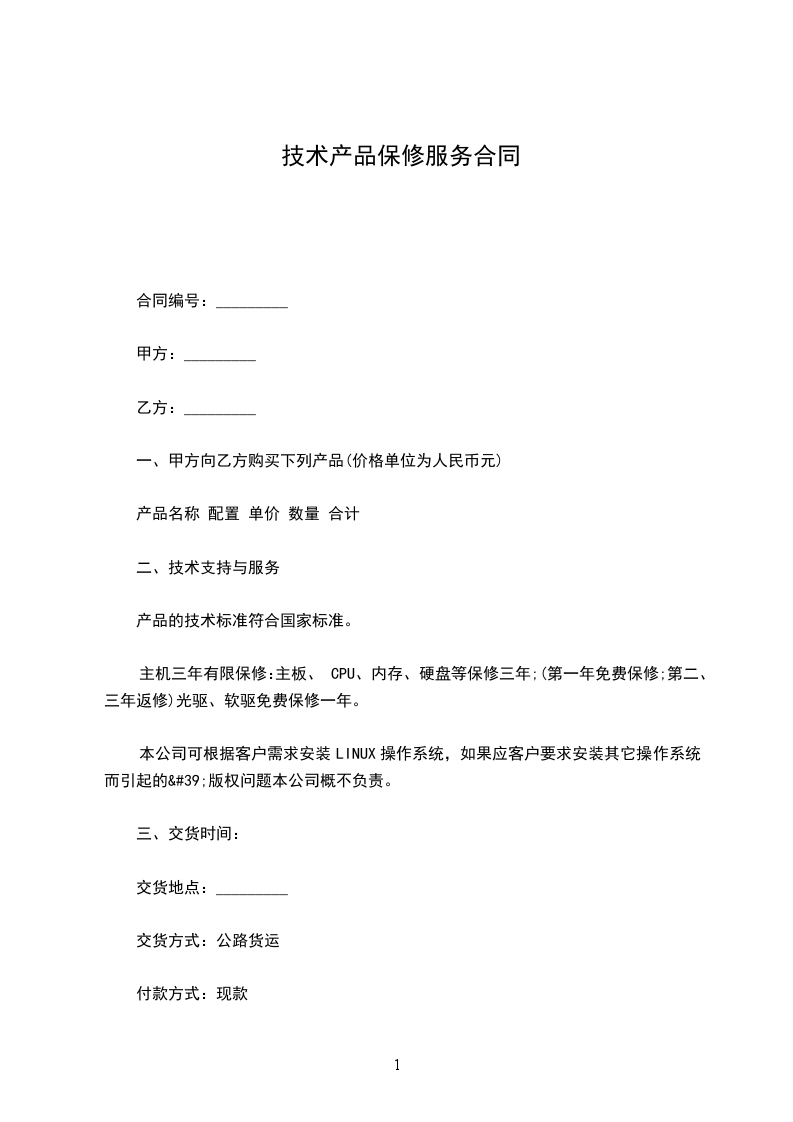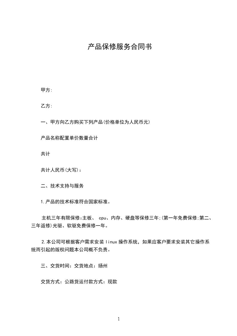 一、甲方向乙方购买下列产品(价格单位为人民币________元)