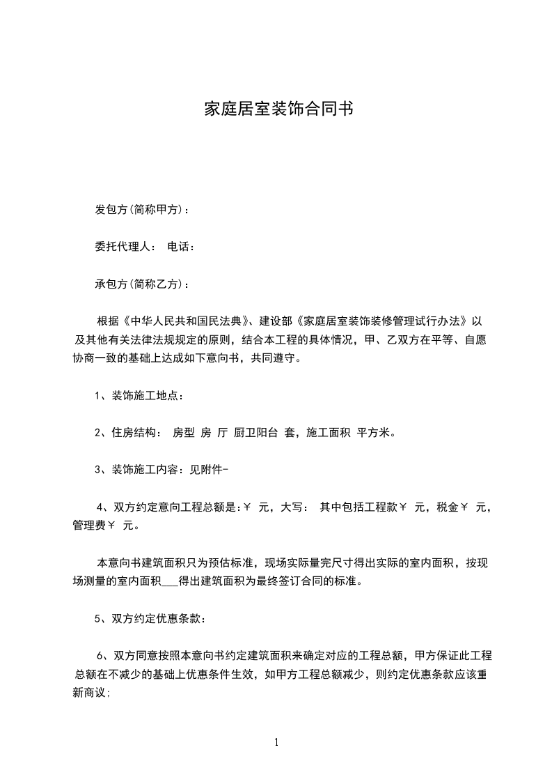 根据《中华人民共和国民法典》、建设部《家庭居室装饰装修管理试行办法》以及其他有关法律法规规定的原则,结合本工程的具体情况,甲、乙双方在平等、自愿、协商一致的基础上达成如下意向书,共同遵守。