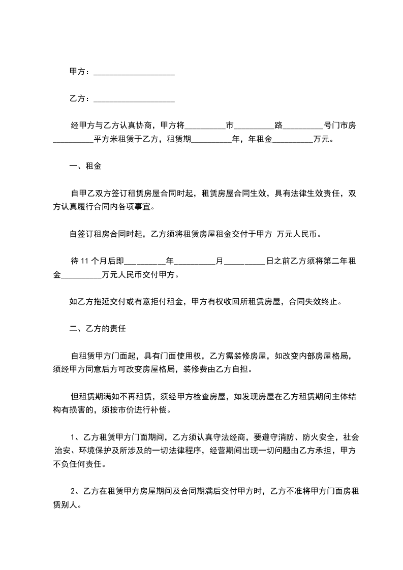 四、出租期限:甲方出_____年_____月_____日交给乙方房子,租期为五年,租费一年一付,年元,年年每年元,年至年租费统一开业当天付清。