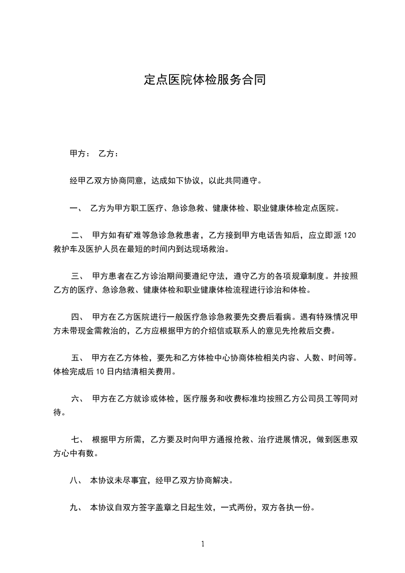 一、 乙方为甲方职工医疗、急诊急救、健康体检、职业健康体检定点医院。