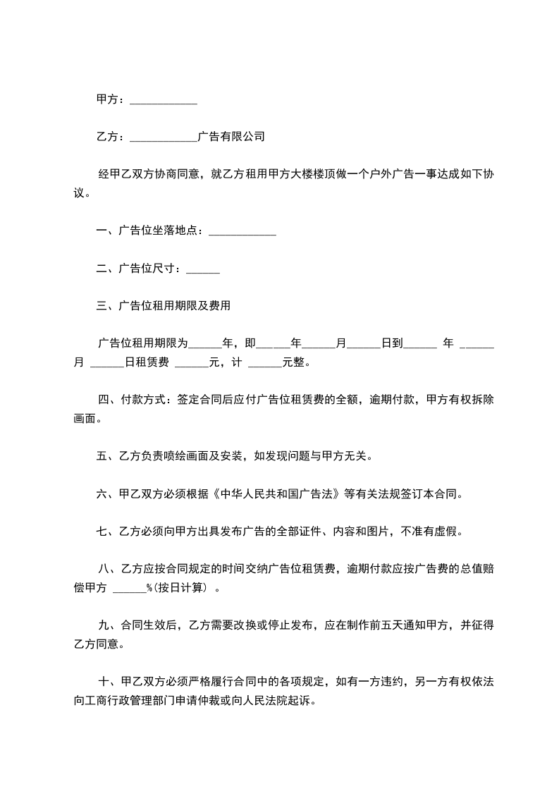 经甲乙双方协商同意,就乙方租用甲方大楼楼顶做一个户外广告一事达成如下协议。