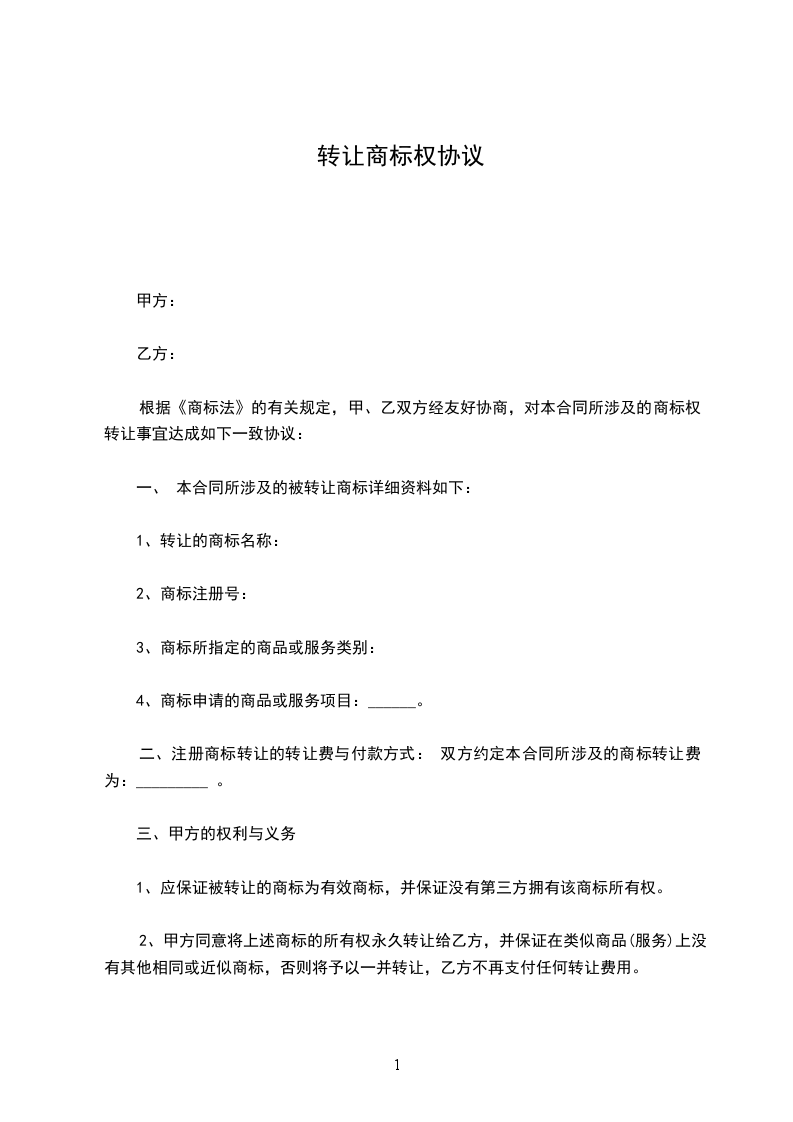 1.被转让商标在向国家商标局办理申请转让手续,乙方即成为该被转让商标的权利所有人。
