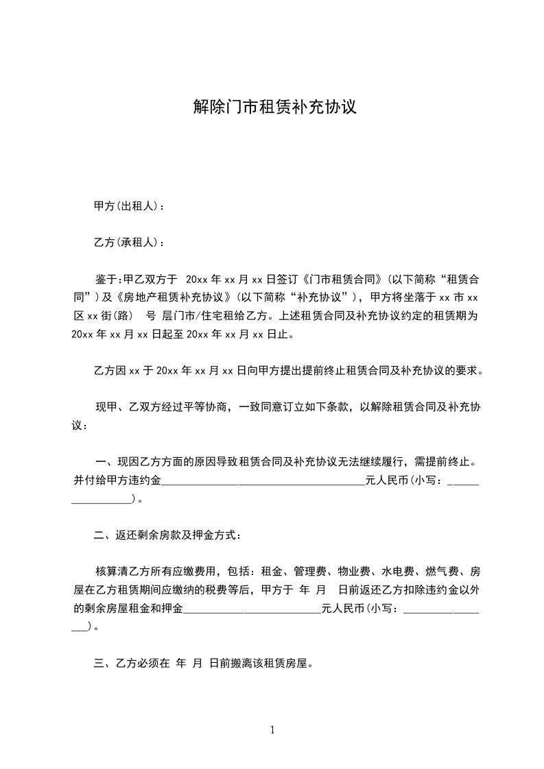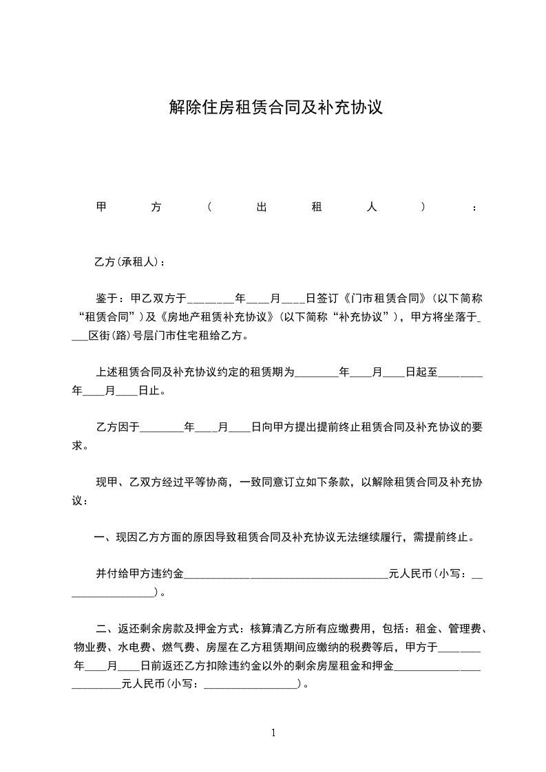 现甲、乙双方经过平等协商,一致同意订立如下条款,以解除租赁合同及补充协议: