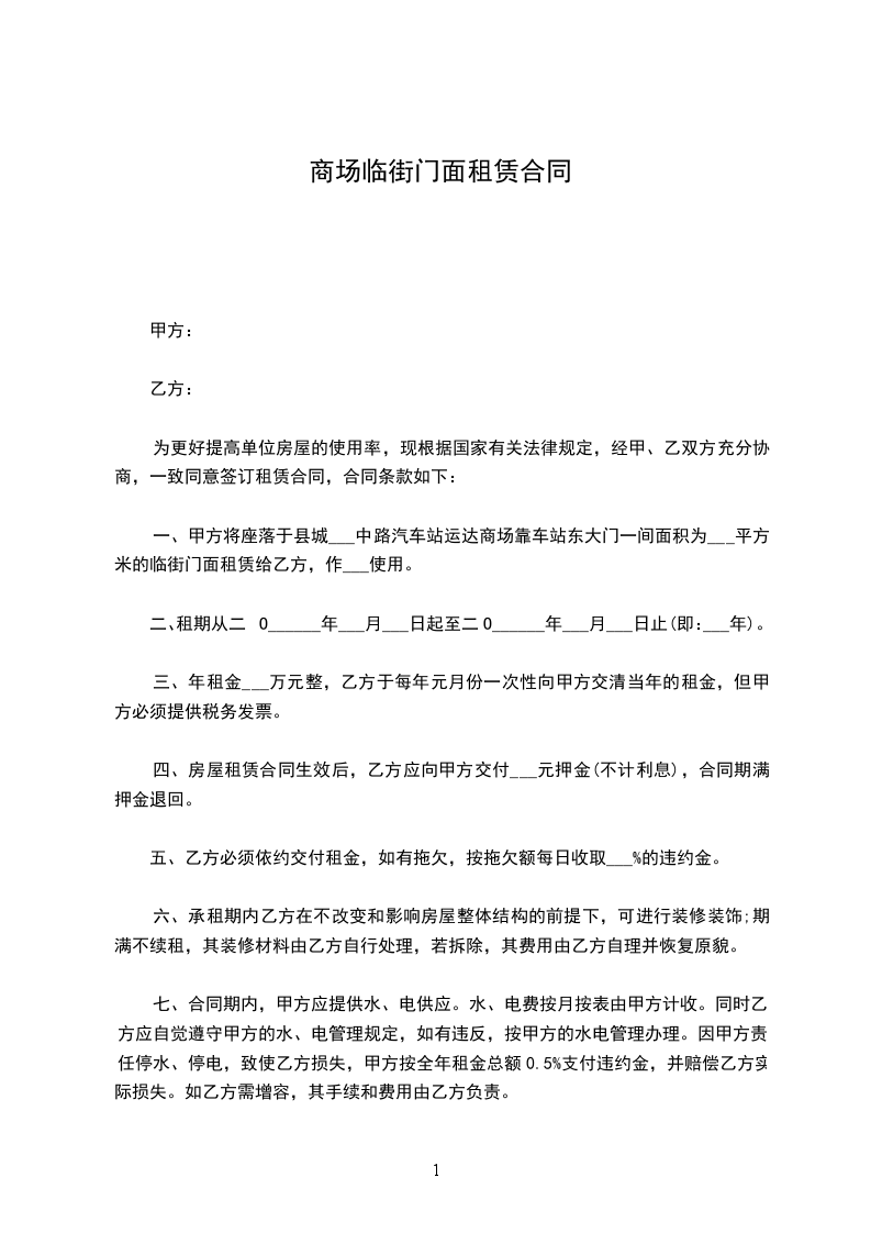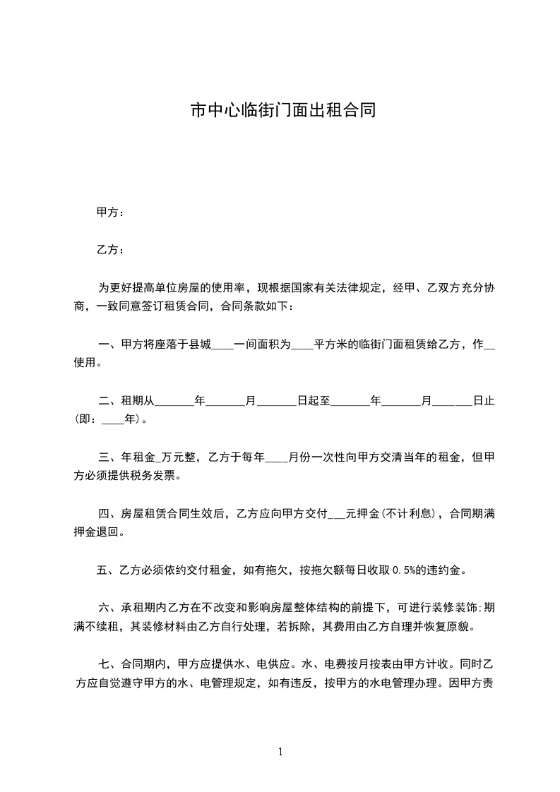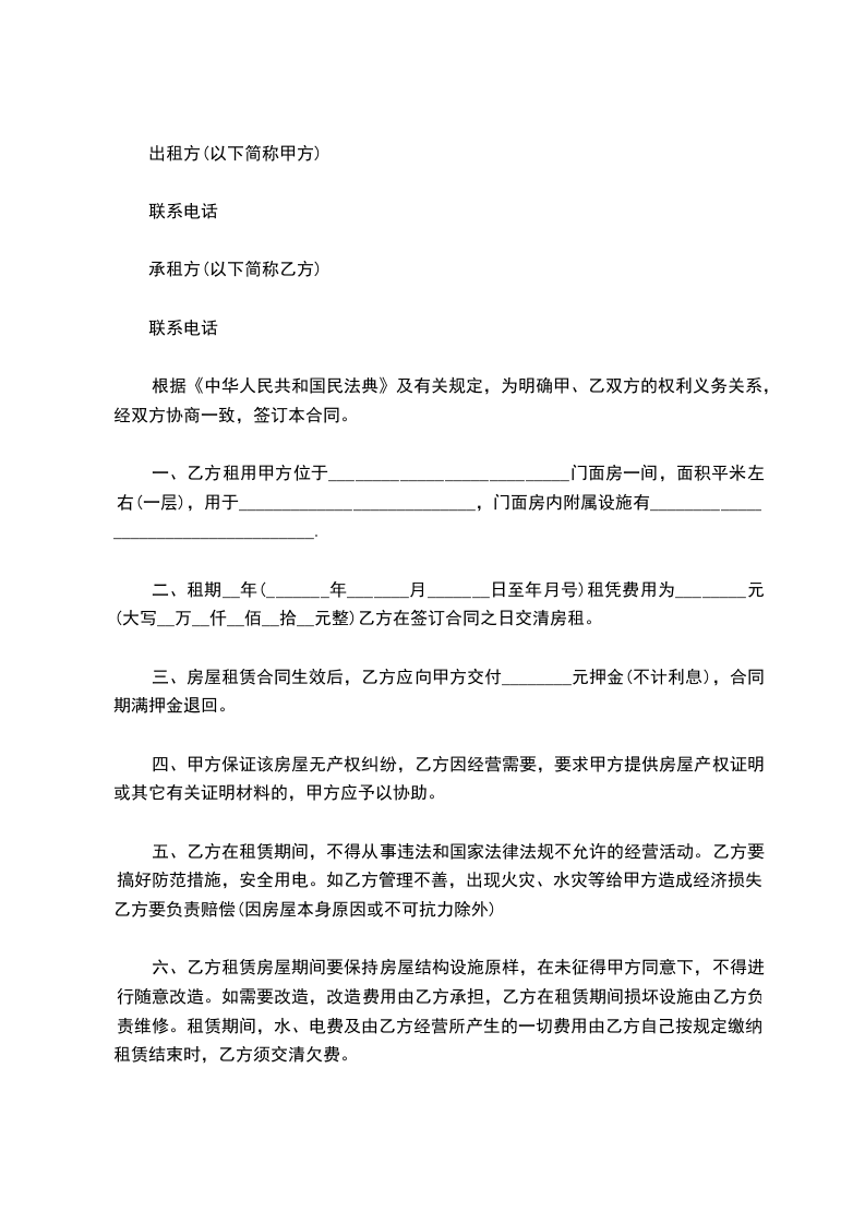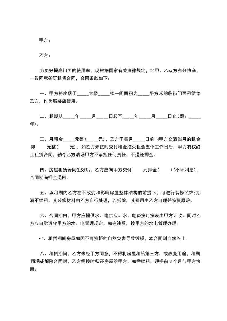 一、甲方将 租给乙方使用。同时该门面内的设施(卷闸门、电线、灯管、开关、水管、地板、楼梯、扶手等)在现有完好状态移交给乙方管理使用。