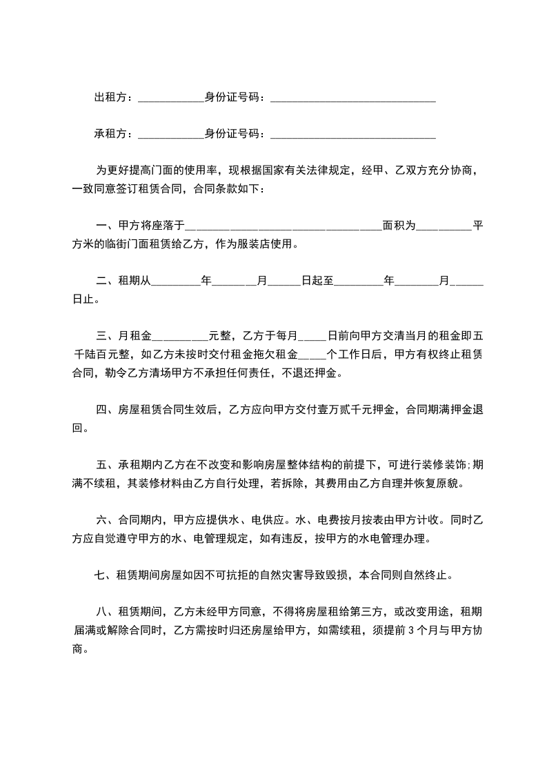 二、租赁期限:租赁期限为 年,自 年 月 日至 年 月 日止, 年之内房租不得变动。租赁期满,如乙方需要继续承租,必须提前一个月向甲方书面申请,在相等条件下,甲方应当优先租赁给乙方, .