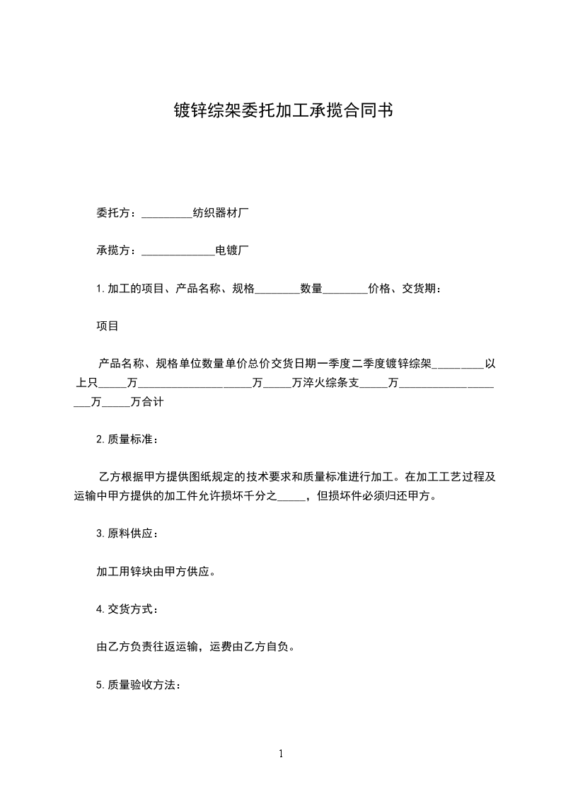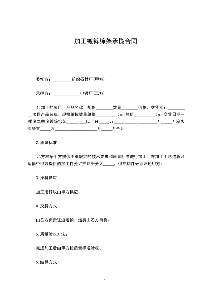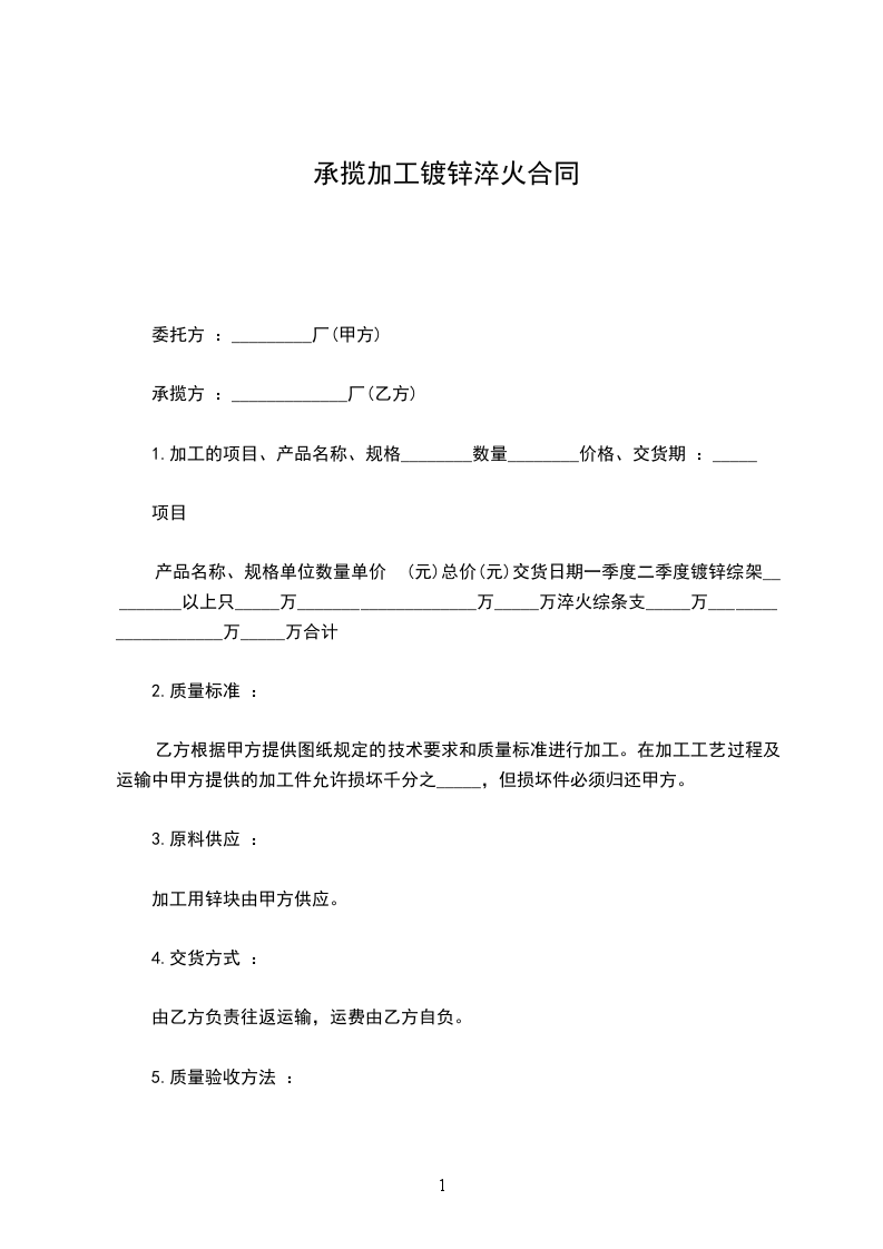 甲方委托乙方加工镀锌、淬火等,乙方应按规定日期完成;逾期由乙方负担甲方的经济损失,每天按加工产品总值千分之交纳罚金。甲方未按规定的时间和数量交付乙方加工物品,因而造成乙方停工损失,应按实际损失赔偿。