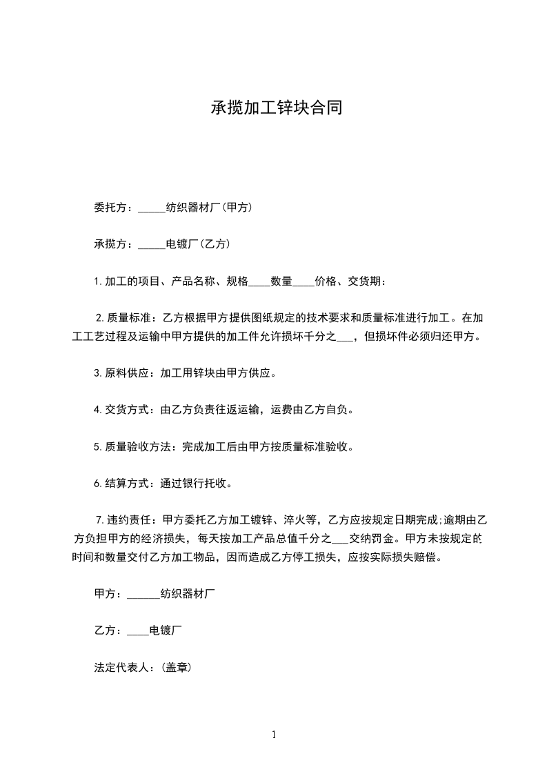 乙方根据甲方提供图纸规定的技术要求和质量标准进行加工。在加工工艺过程及运输中甲方提供的加工件允许损坏千分之,但损坏件必须归还甲方。