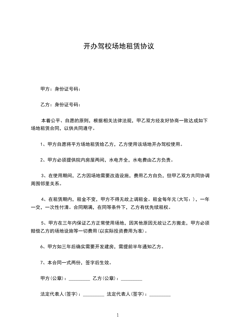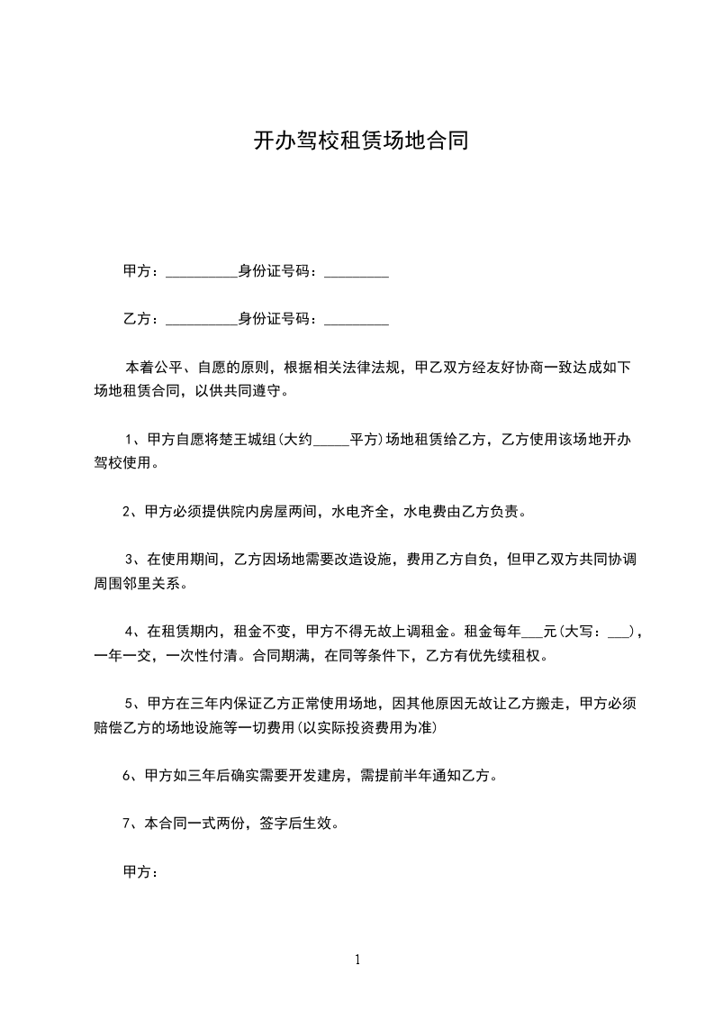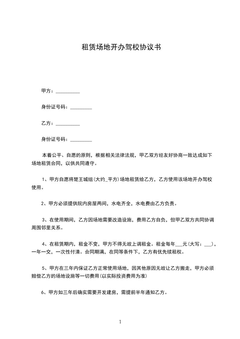 1、甲方自愿将平方场地租赁给乙方,乙方使用该场地开办驾校使用。