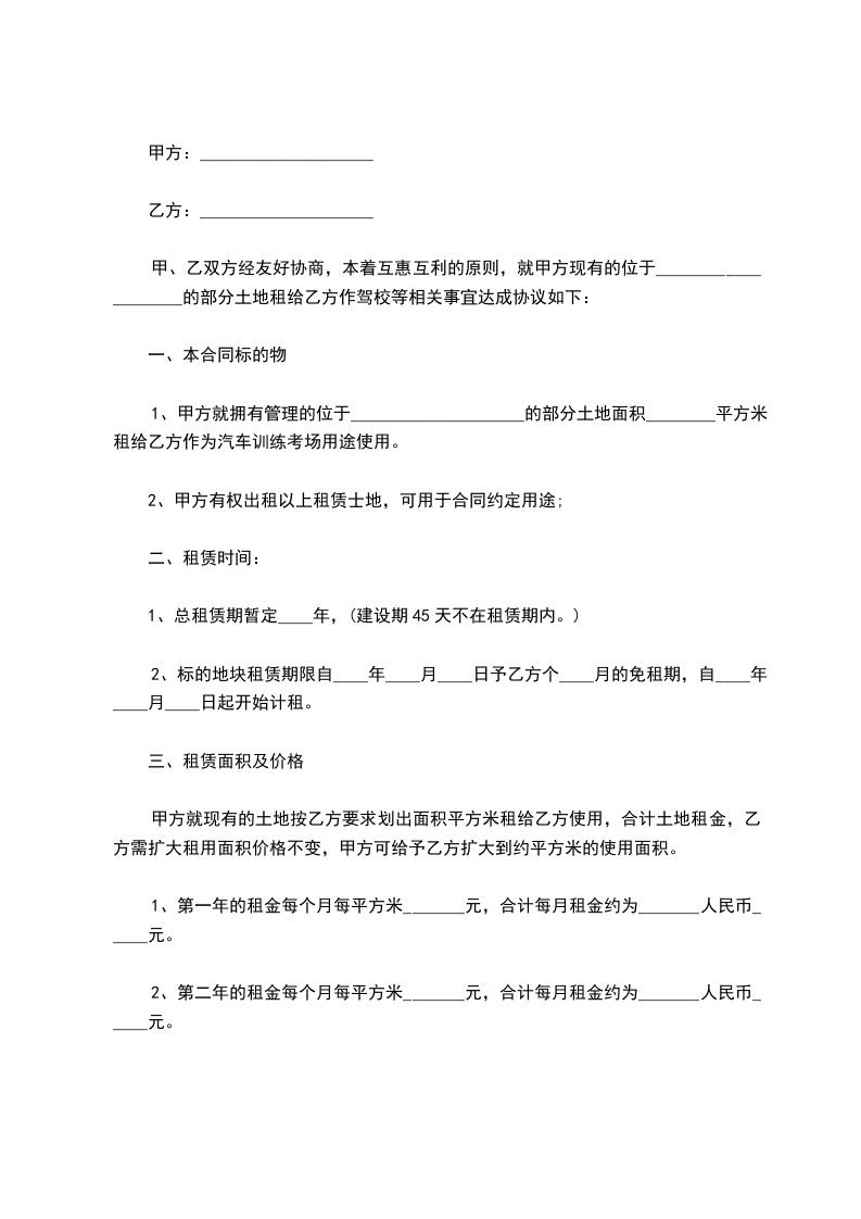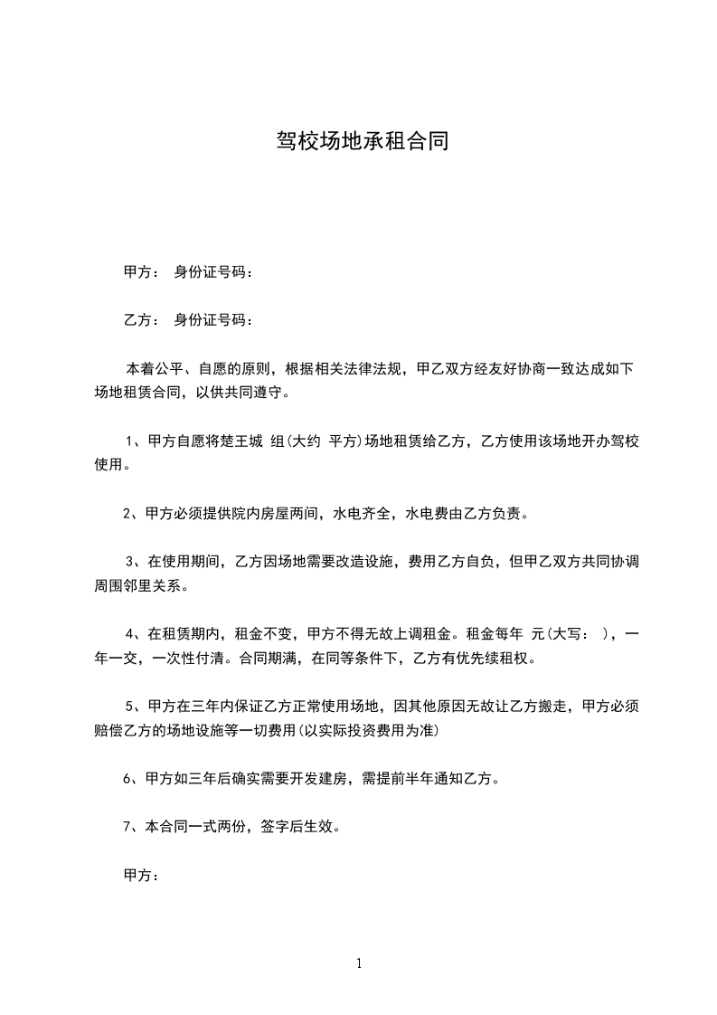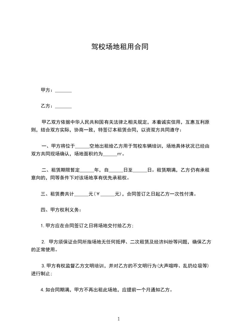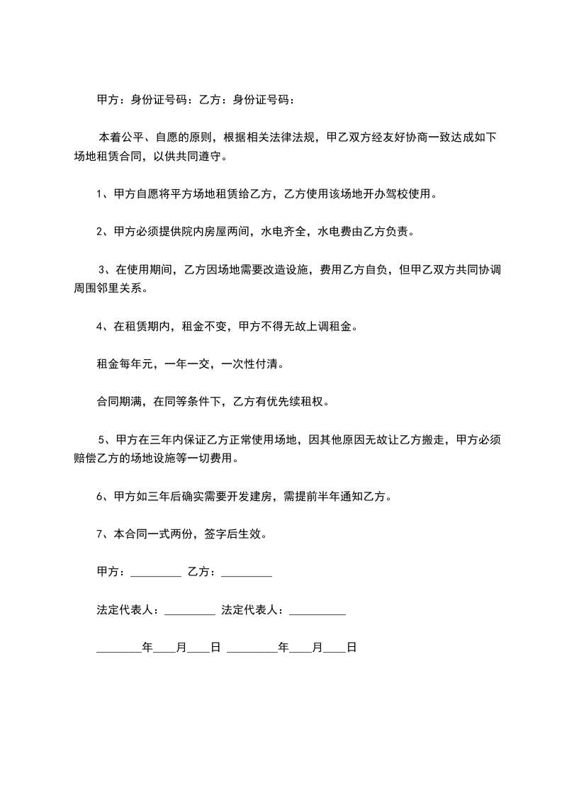 1、甲方自愿将平方场地租赁给乙方,乙方使用该场地开办驾校使用。
