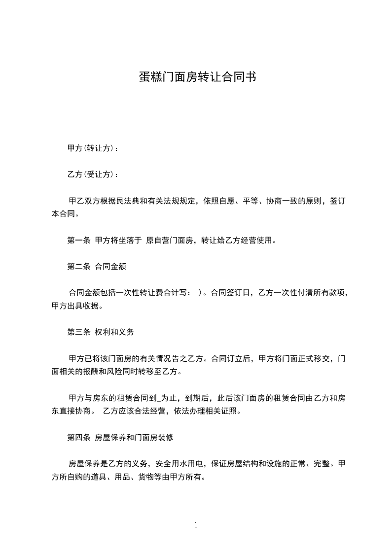 第一条 甲方将坐落于 原自营门面房,转让给乙方经营使用。