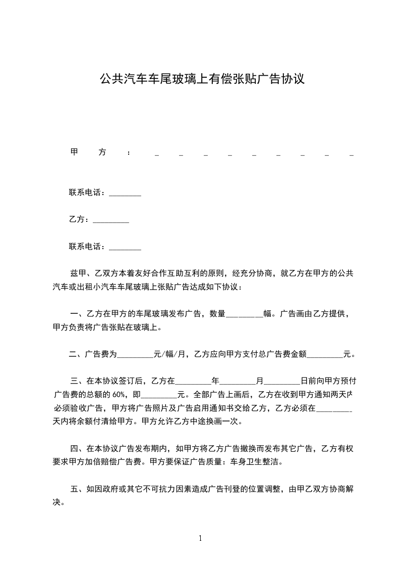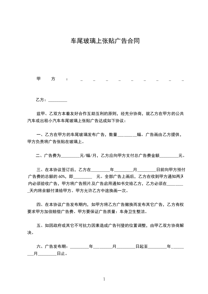 一、乙方在甲方的车尾玻璃发布广告,数量_________幅。广告画由乙方提供,甲方负责将广告张贴在玻璃上。