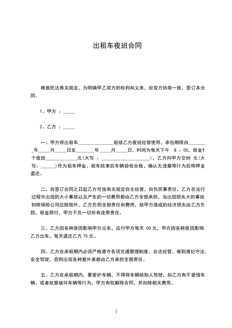 四、乙方在夜班承租期内如发生交通违章、交通事故或其他不可预见性的情况,由乙方负责承担相应的法律责任及全部损失并承担给甲方造成的损失。