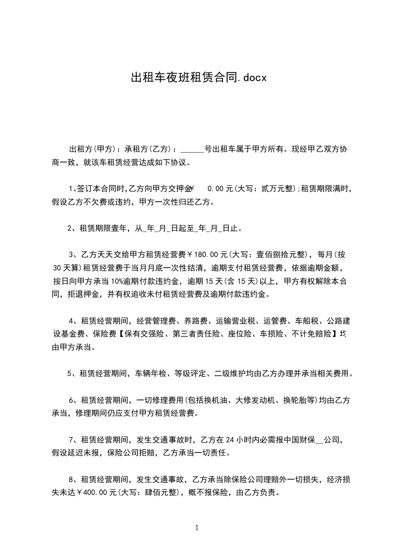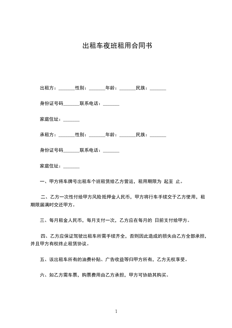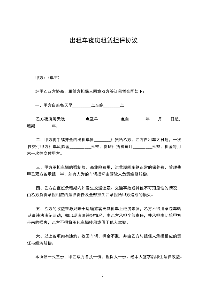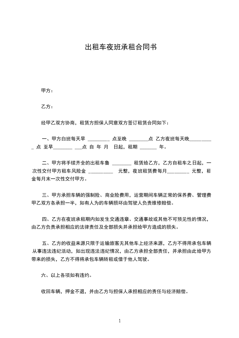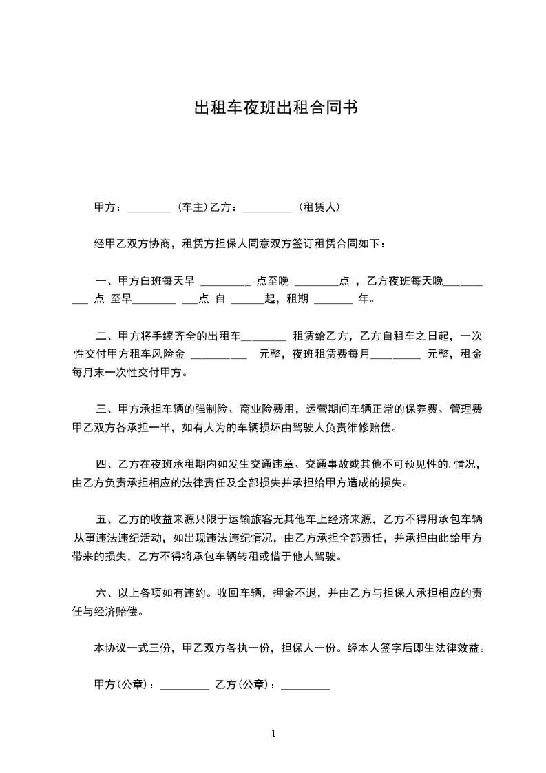 二、甲方将手续齐全的出租车鲁________租赁给乙方,乙方自租车之日起,一次性交付甲方租车风险金__________元整,夜班租赁费每月_________元整,租金每月末一次性交付甲方。