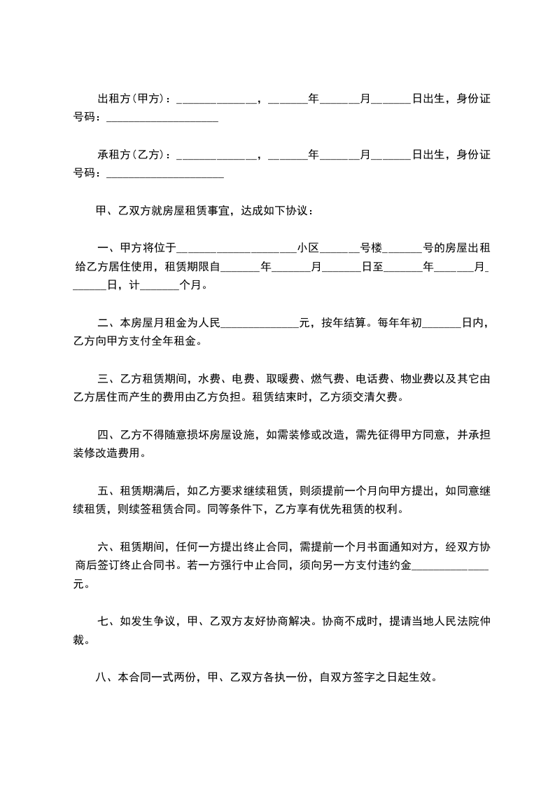 六、房屋租赁期从_____年___月____日。到期如续租,甲乙双方需提前一个月协商,租金另行商定。