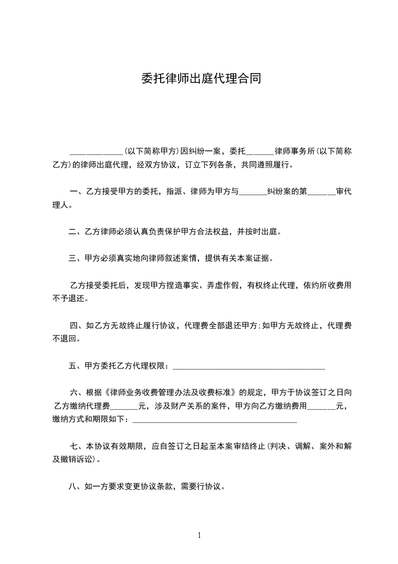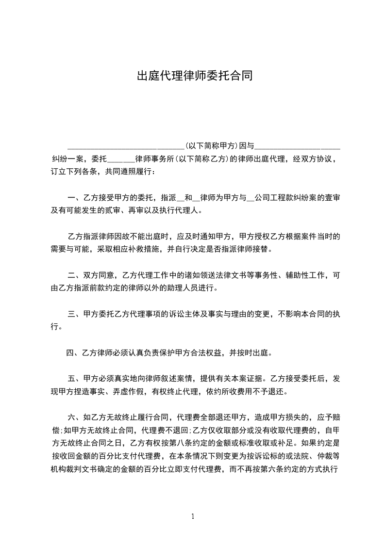 一、乙方接受甲方的委托,指派_______律师为甲方与____________纠纷案的第_______审代理人。