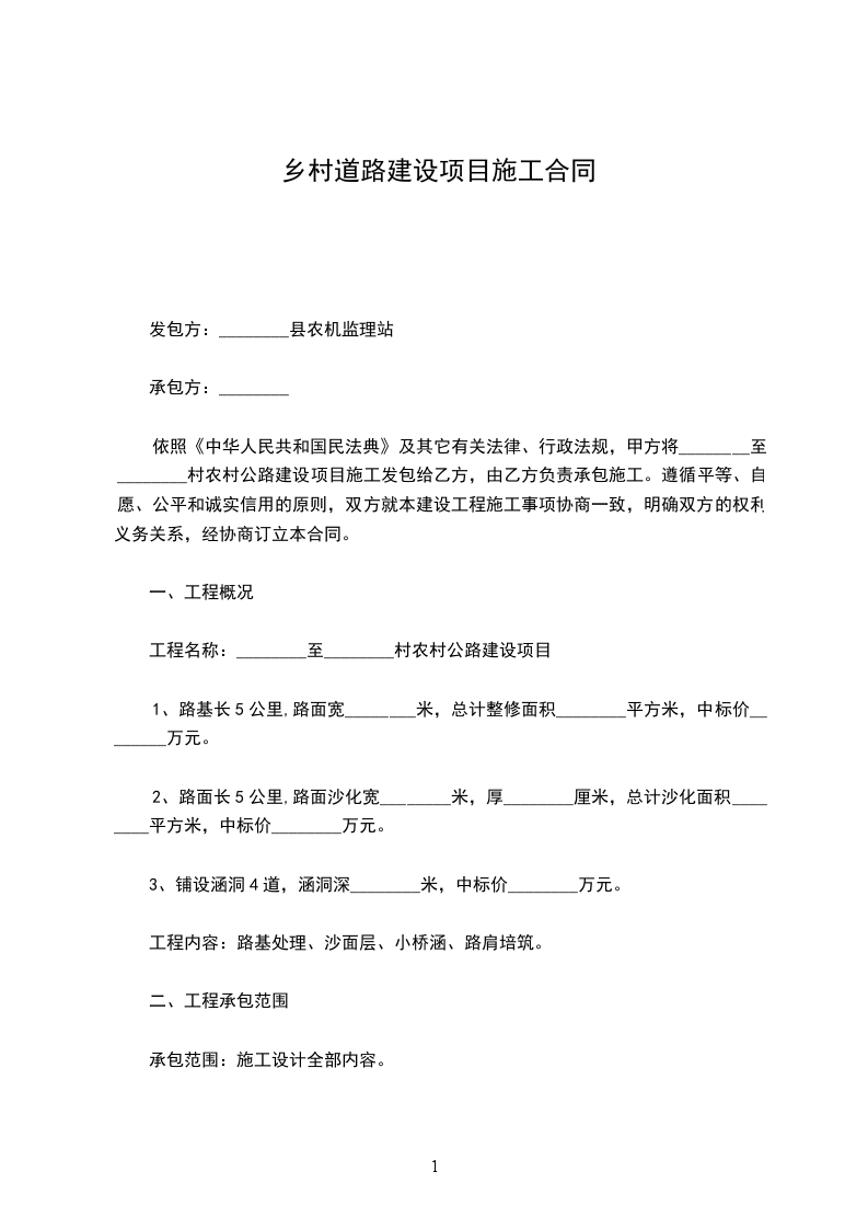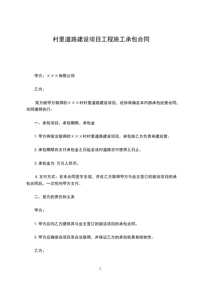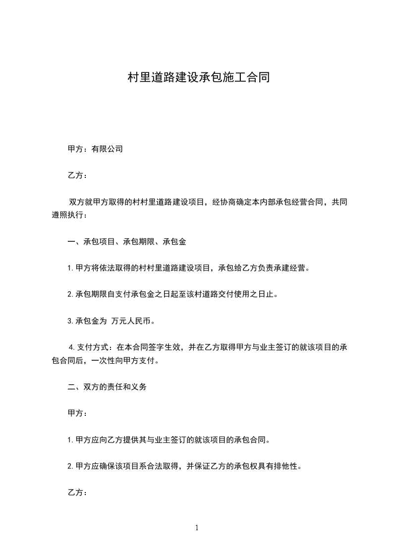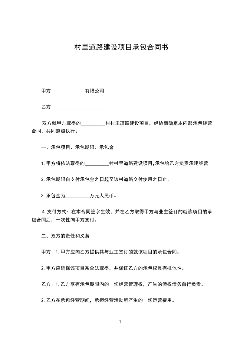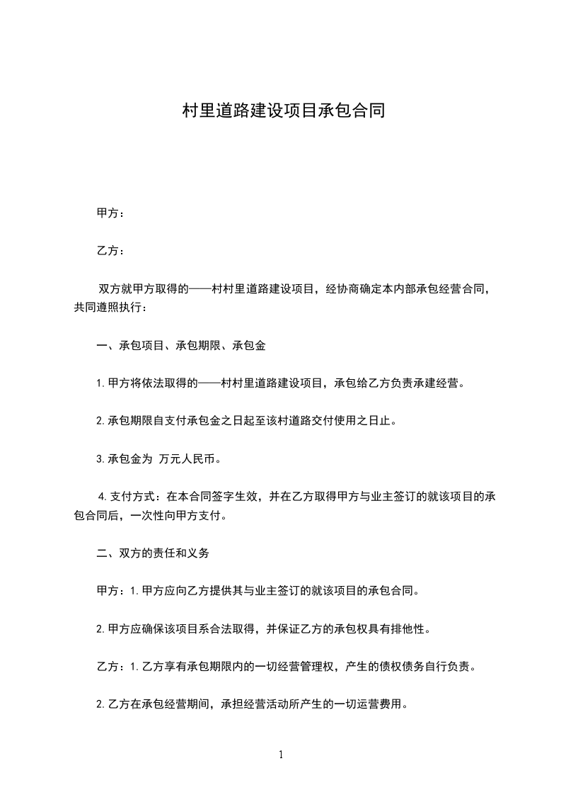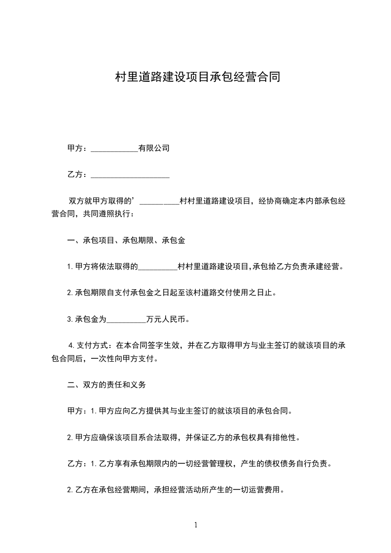 1.甲方将依法取得的村村里道路建设项目,承包给乙方负责承建经营。