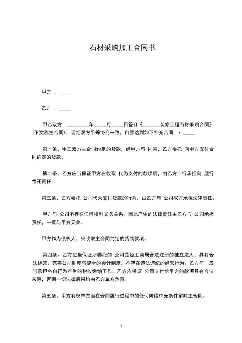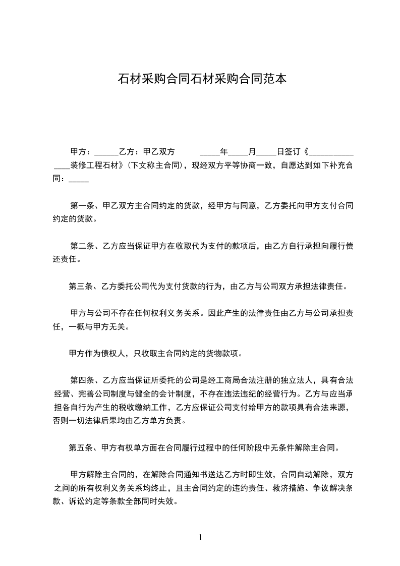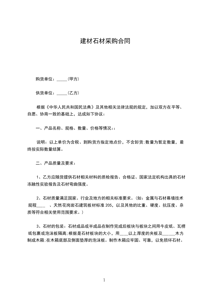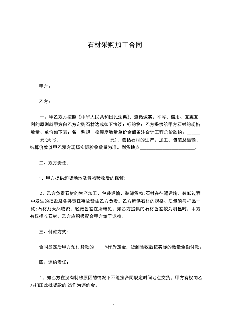 一、甲乙双方按照《中华人民共和国民法典》,遵循诚实、平等、信用、互惠互利的原则就甲方向乙方定购石材达成如下协议:标的物:乙方提供给甲方石材的规格、数量、单价如下表:名 称规 格厚度数量单价金额备注合计工程总价款约:__________元(大写:_____________________元),包括石材的生产、加工、包装及运输,结算价款以甲乙双方现场实际验收数量为准。到货地点________________________。