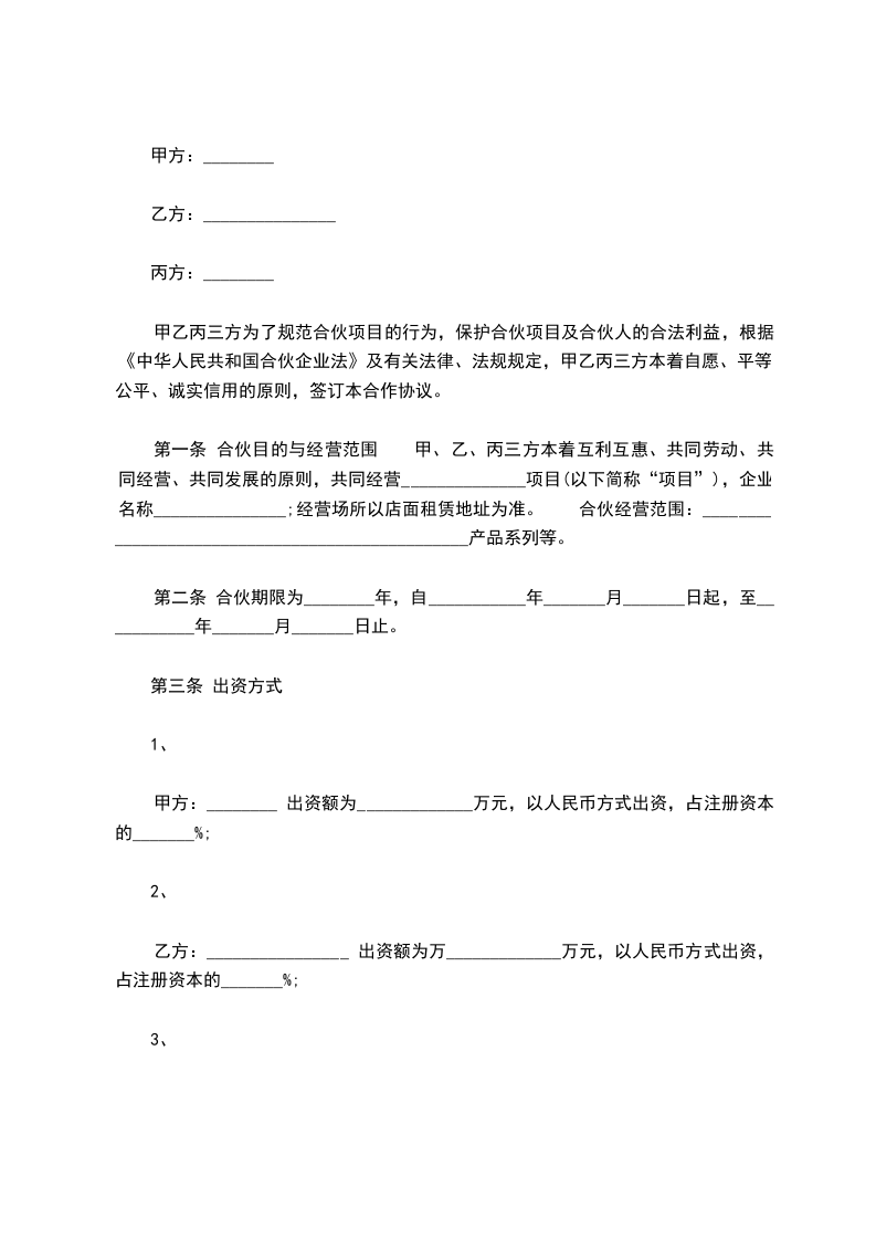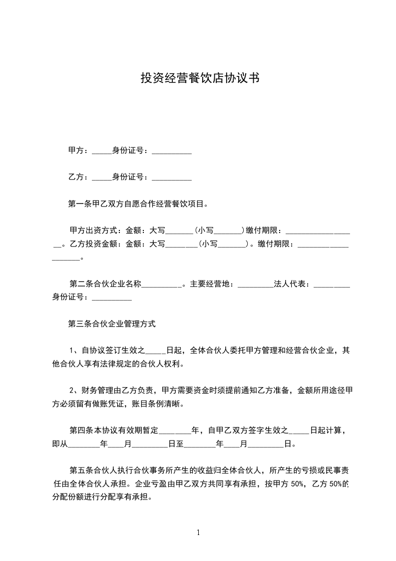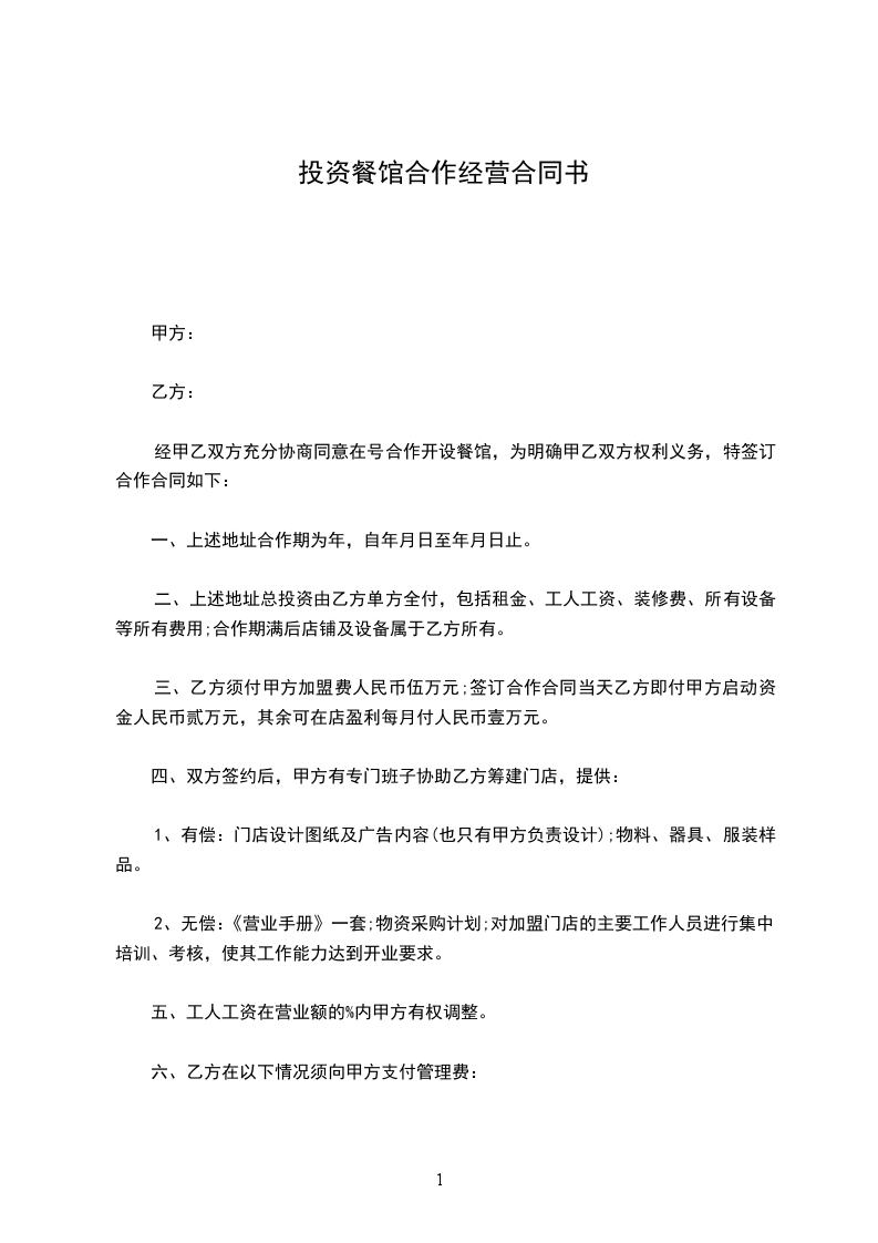 经甲乙双方充分协商同意在号合作开设餐馆,为明确甲乙双方权利义务,特签订合作合同如下: